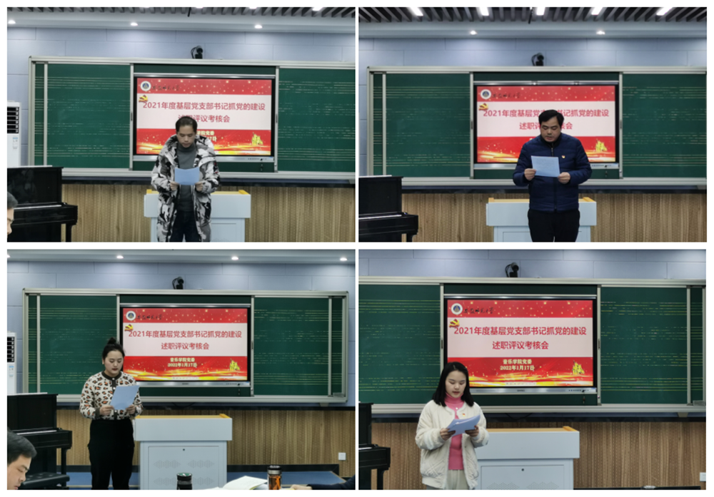 教工行政党支部书记梁超、教工声乐党支部书记王文正、员工艺术团支部支委高燕和研究生2020级党支部书记章婷分别进行了年度工作述职,主要从抓支部党建工作责任履行情况、学习贯彻习近平新时代中国特色社会主义思想和党的十九届六中全会精神情况、党史学习教育支部特色活动、抓支部党建工作成效等方面进行述职汇报,列出了“问题清单”,查找个人履职尽责方面的存在的问题,并分析根源症结,谋划党支部2022年工作要点,明确重点任务。公司党委委员对述职党支部进行现场评议,并对述职支部提出相应性改进意见。