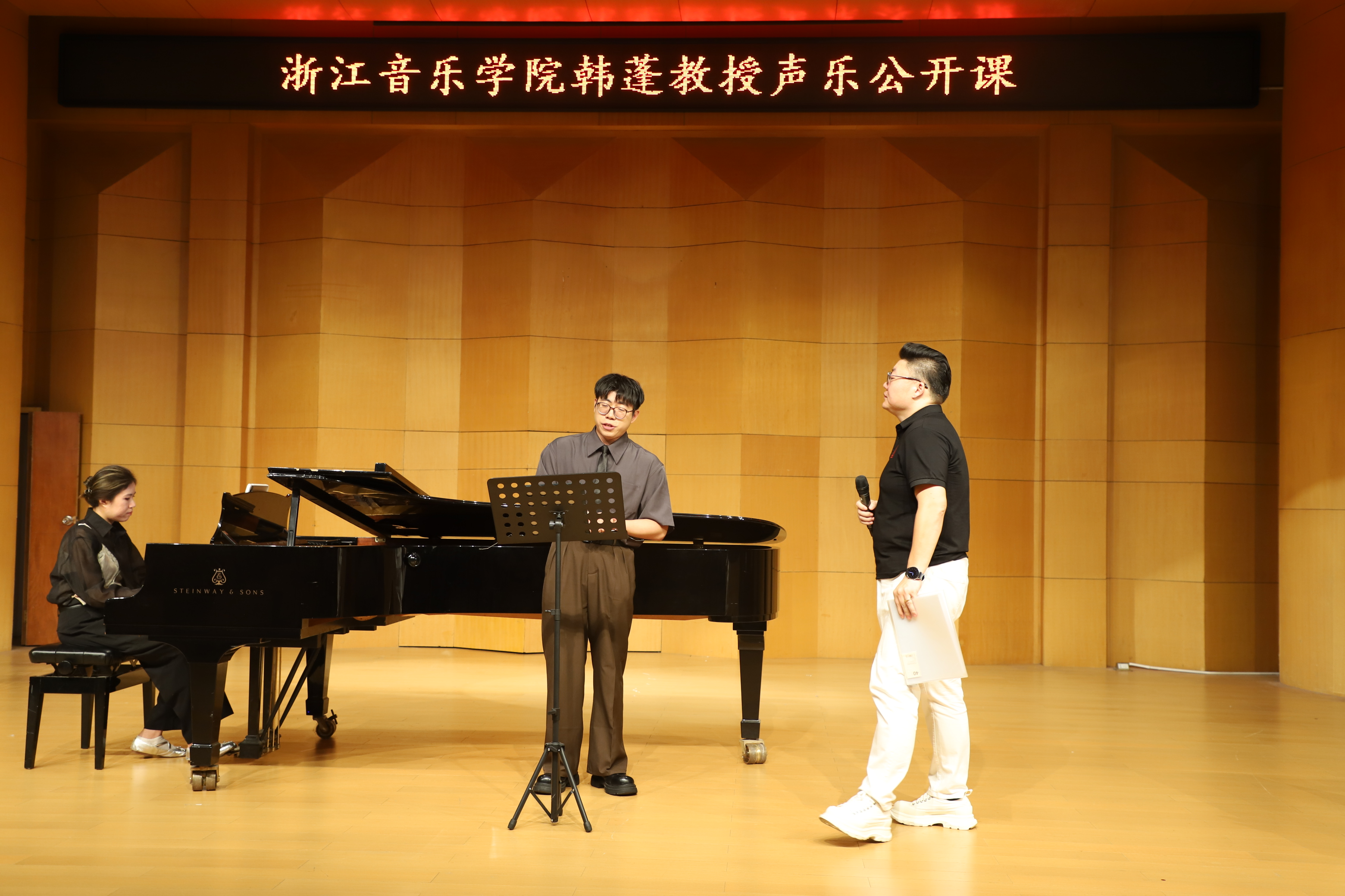 韩蓬教授以其幽默诙谐的教学氛围和深厚的艺术造诣,不仅精准提升了同学们的技术难点,更深刻地诠释了"声乐是技术与艺术完美结合"这一理念。他生动细致的讲解与极富感染力的示范,为在场的每一位师生带来了无尽的启发
