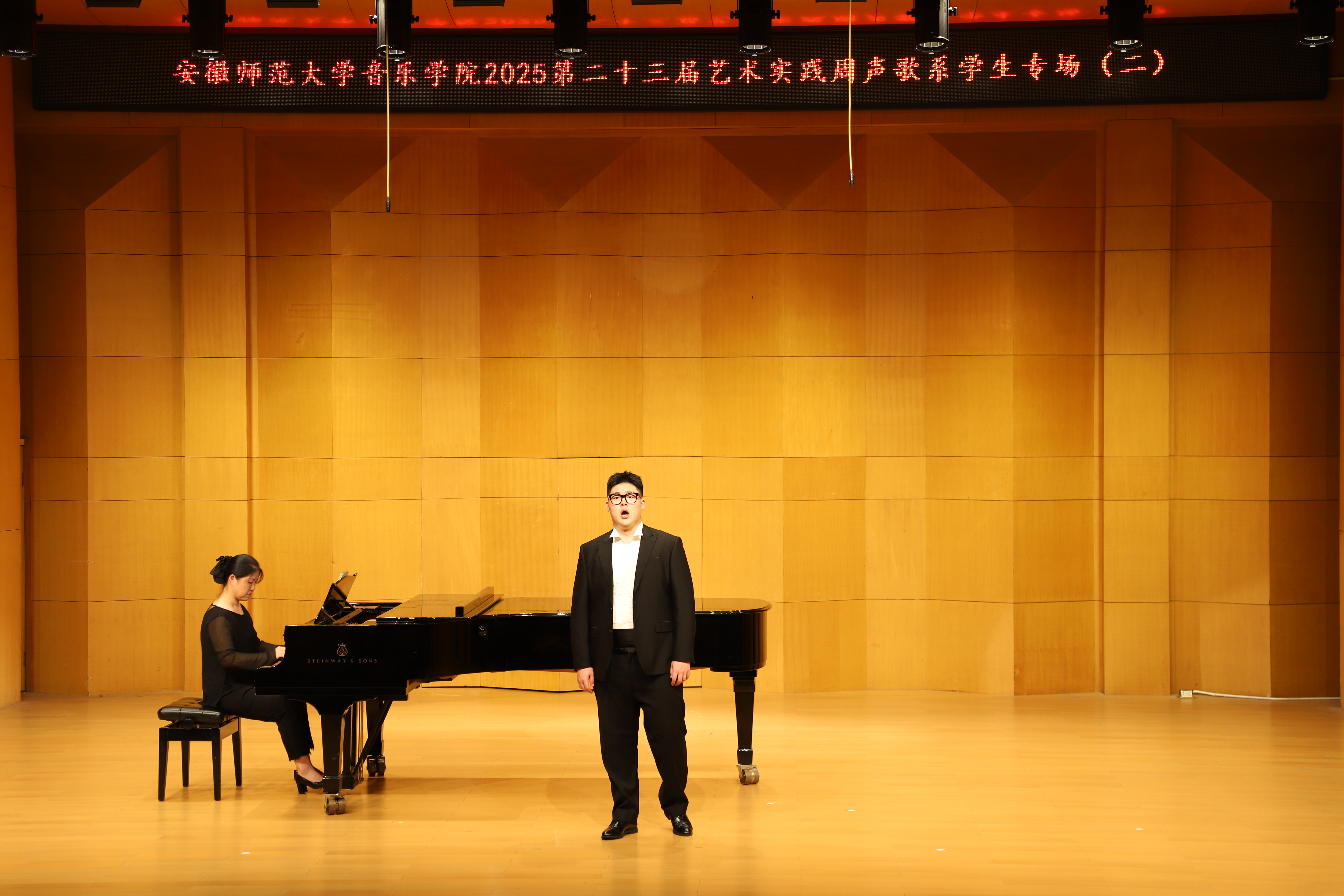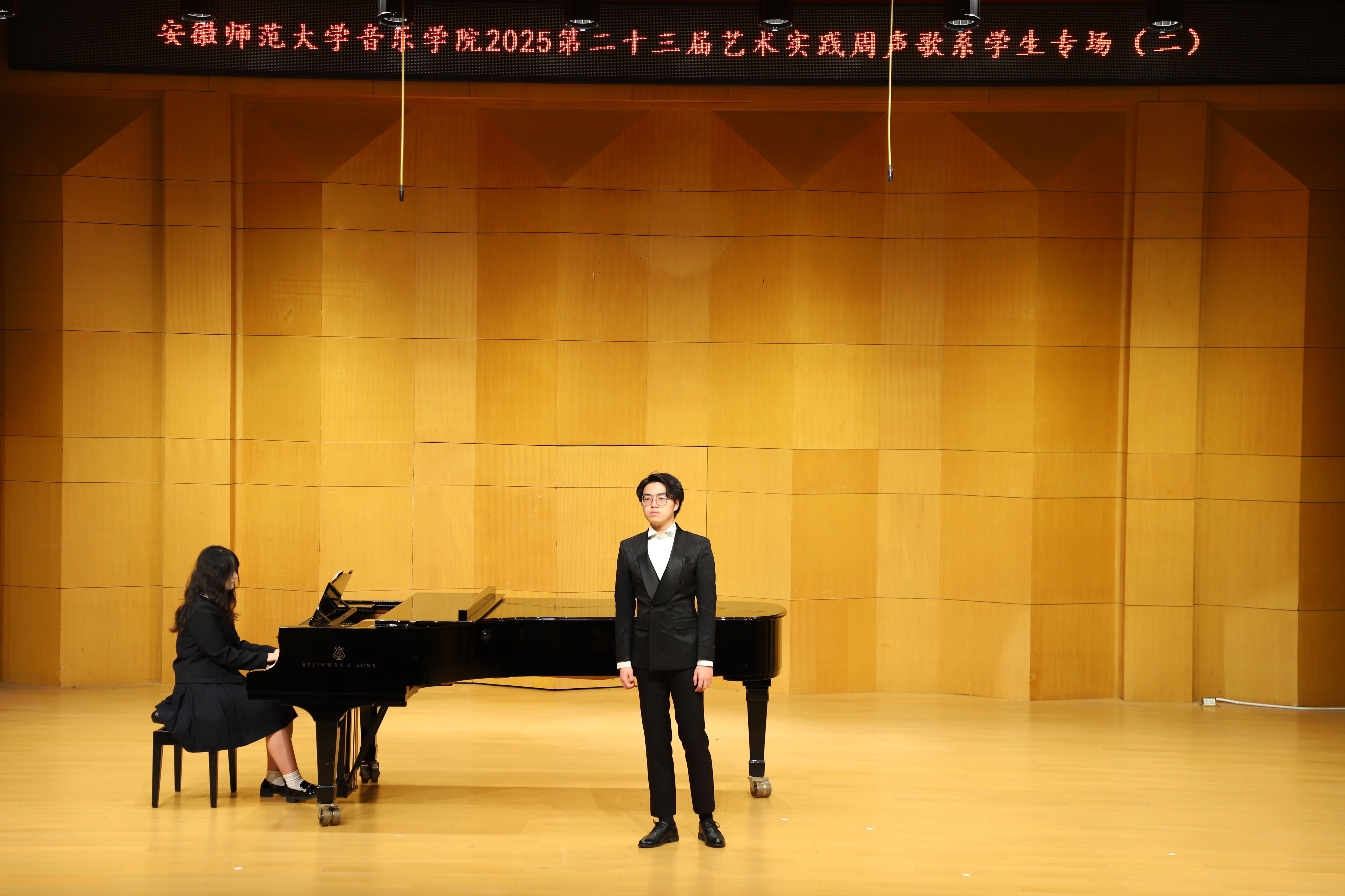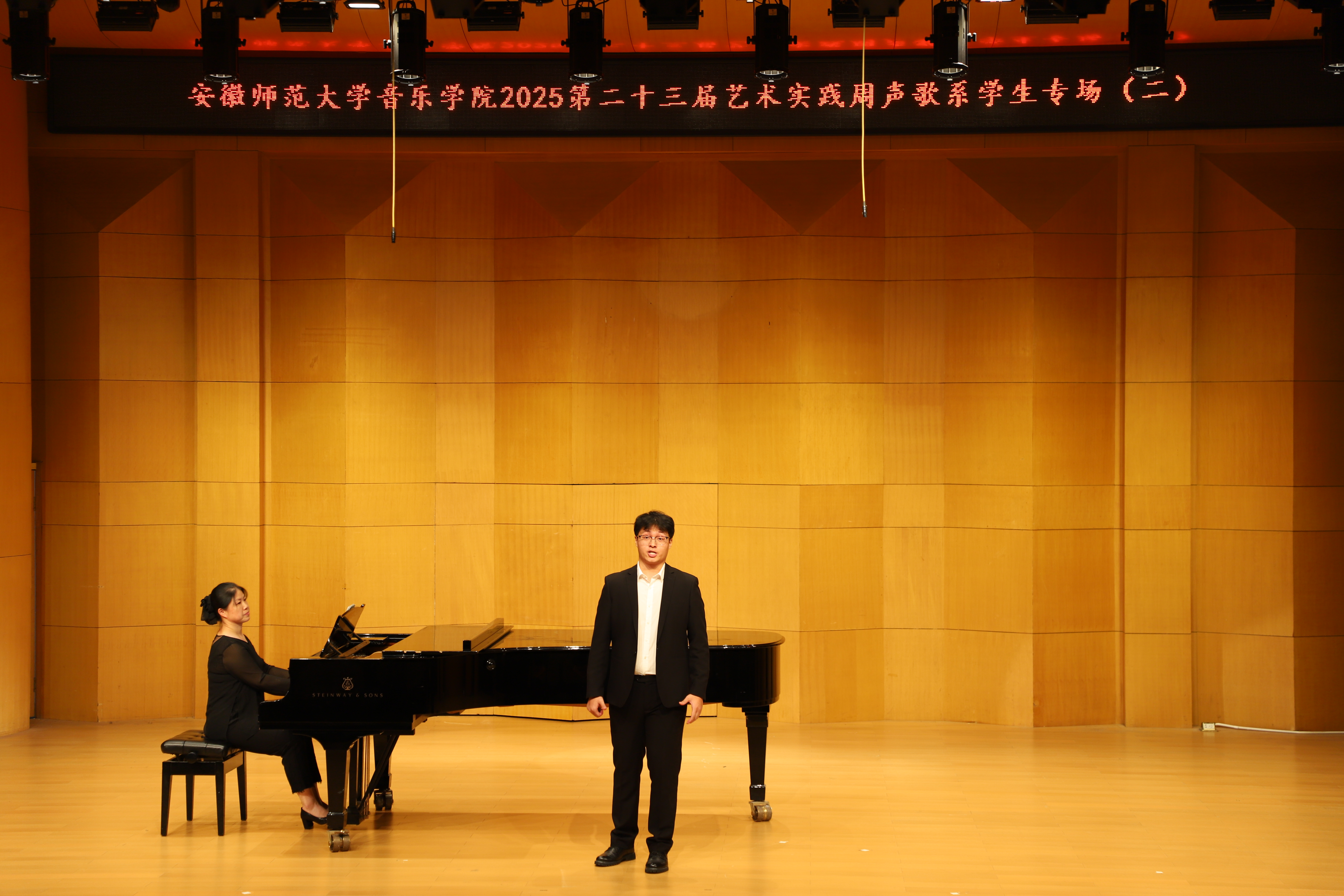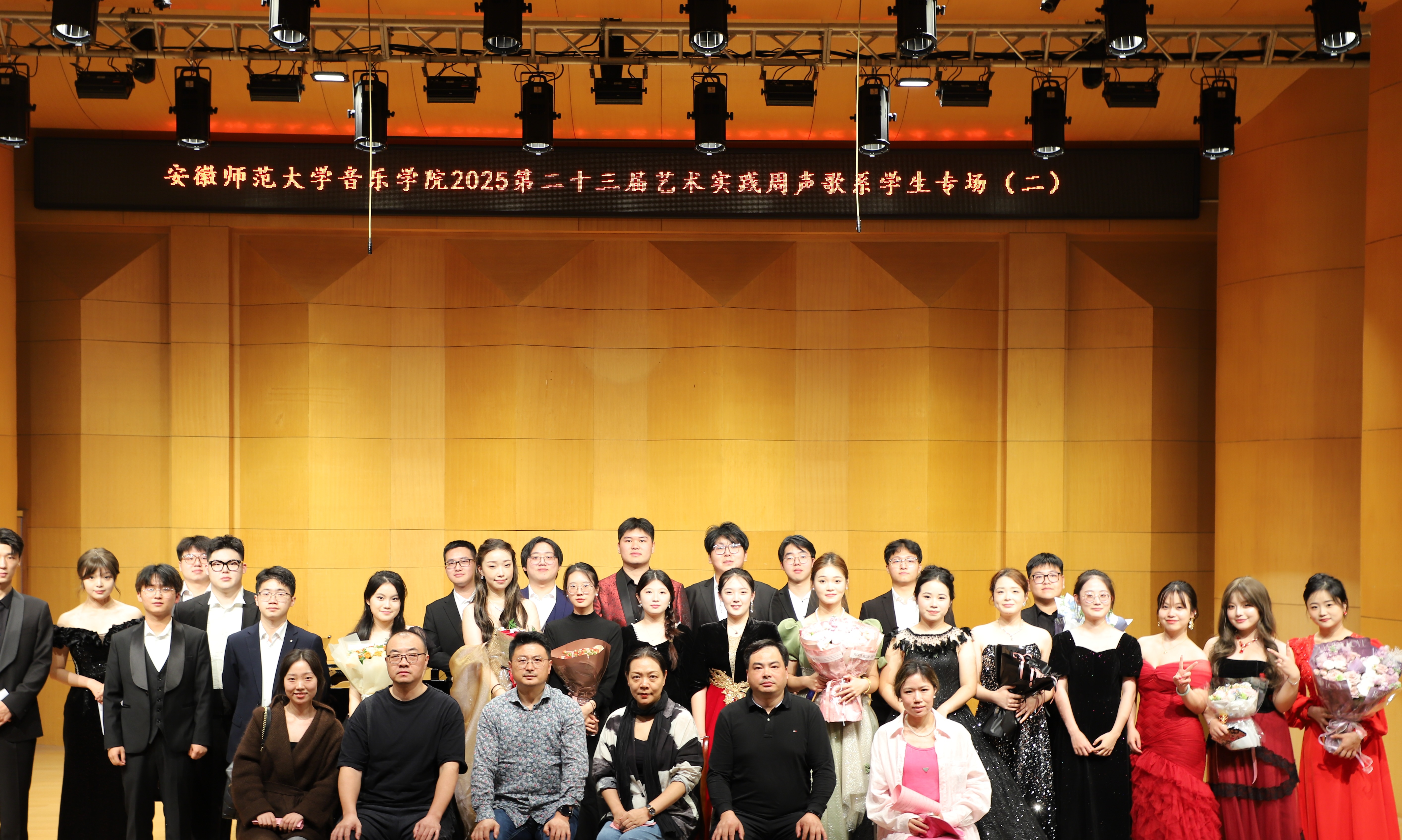 (本网讯 文/郭宇 图/许恺霖)10月13日晚,由公司声歌系举办员工声乐专场(二)圆满结束。本场音乐会由声歌系教师指导的23名2023级本科生出演。演唱歌曲体裁丰富,包括中国经典声乐作品《故土情》《蒹葭》,江苏民歌《拔根芦柴花》,外国艺术歌曲《请别忘了我》《多么可爱,多么美丽》,歌剧选段《像天使一样美丽》《人们叫我咪咪》等。