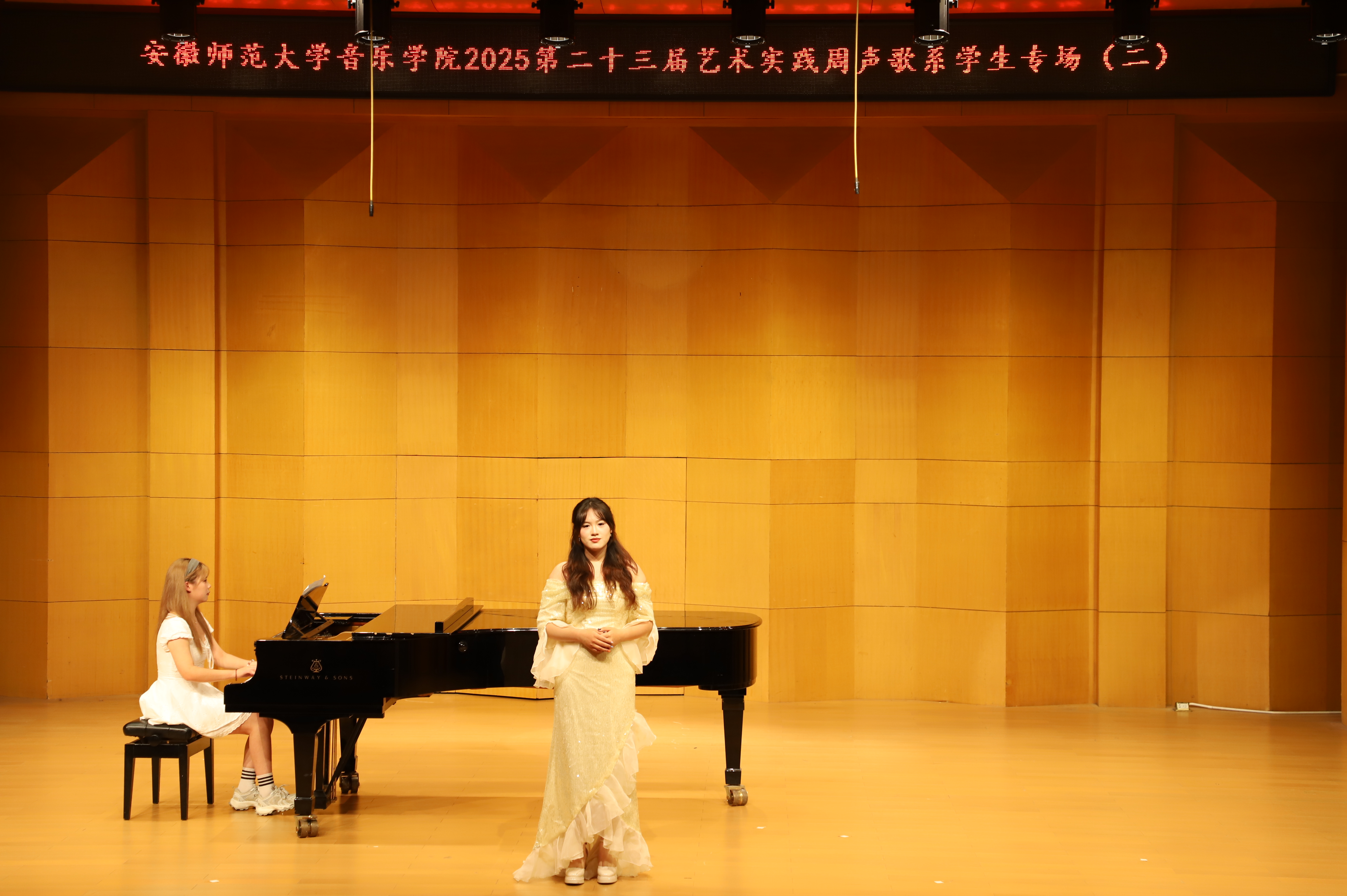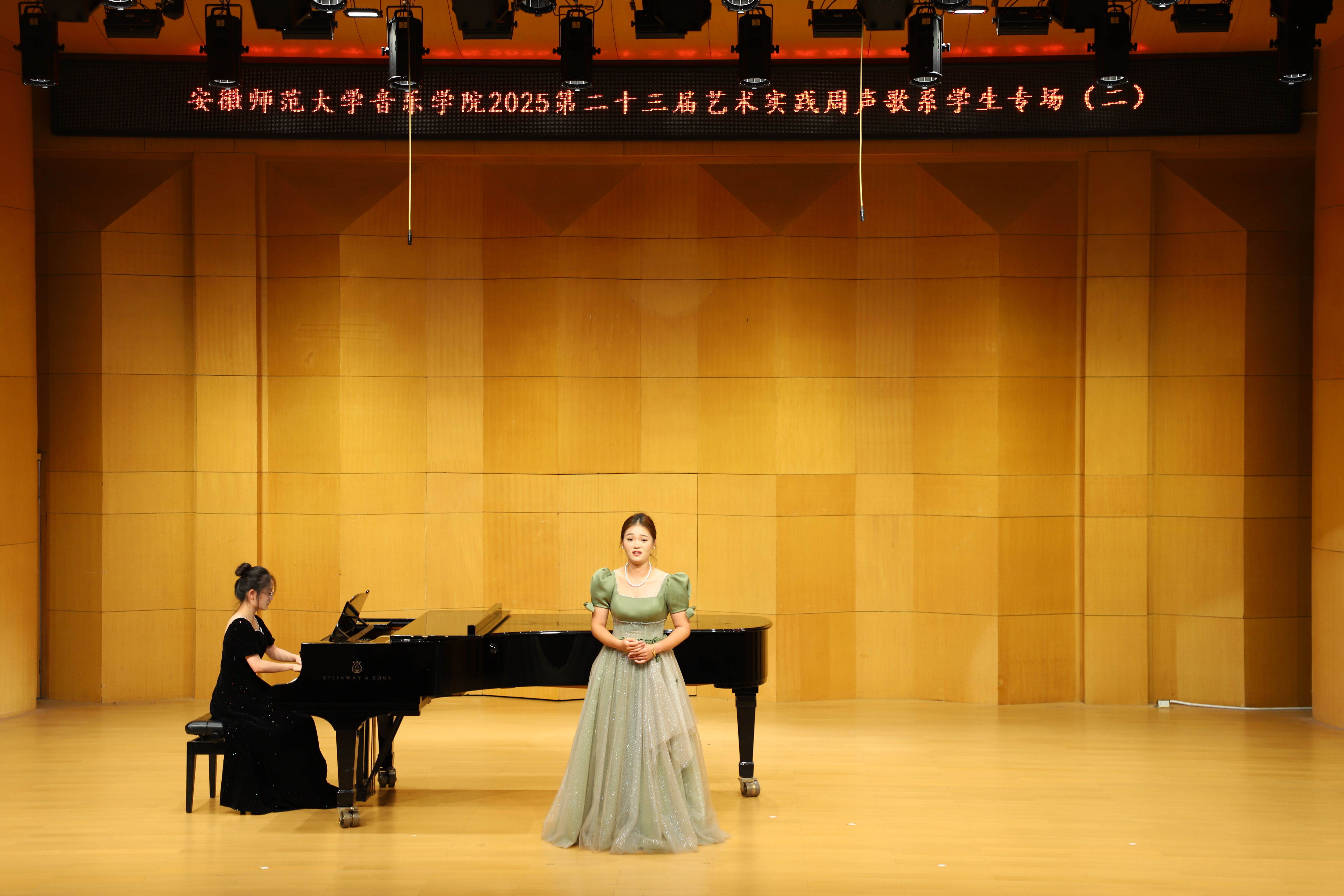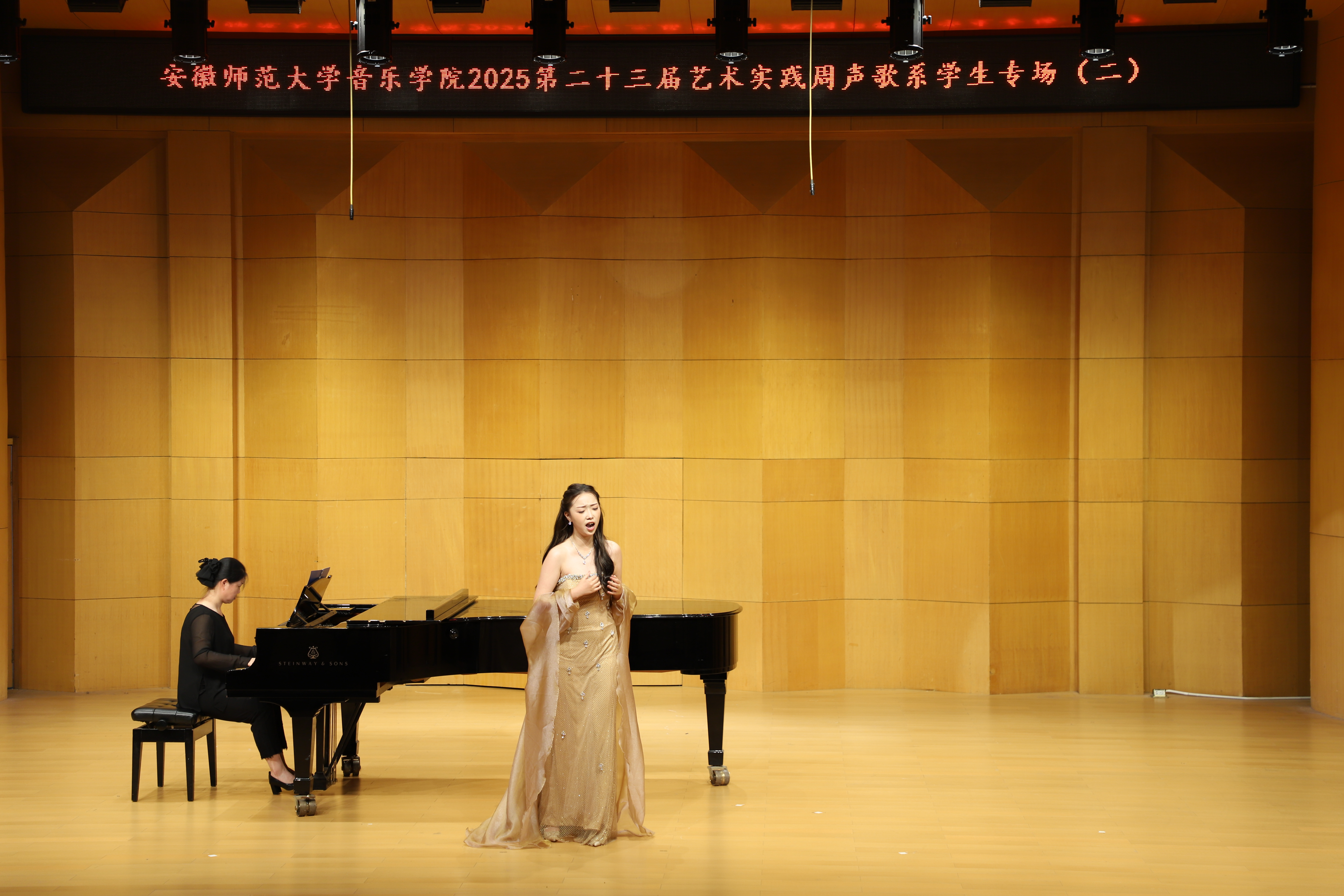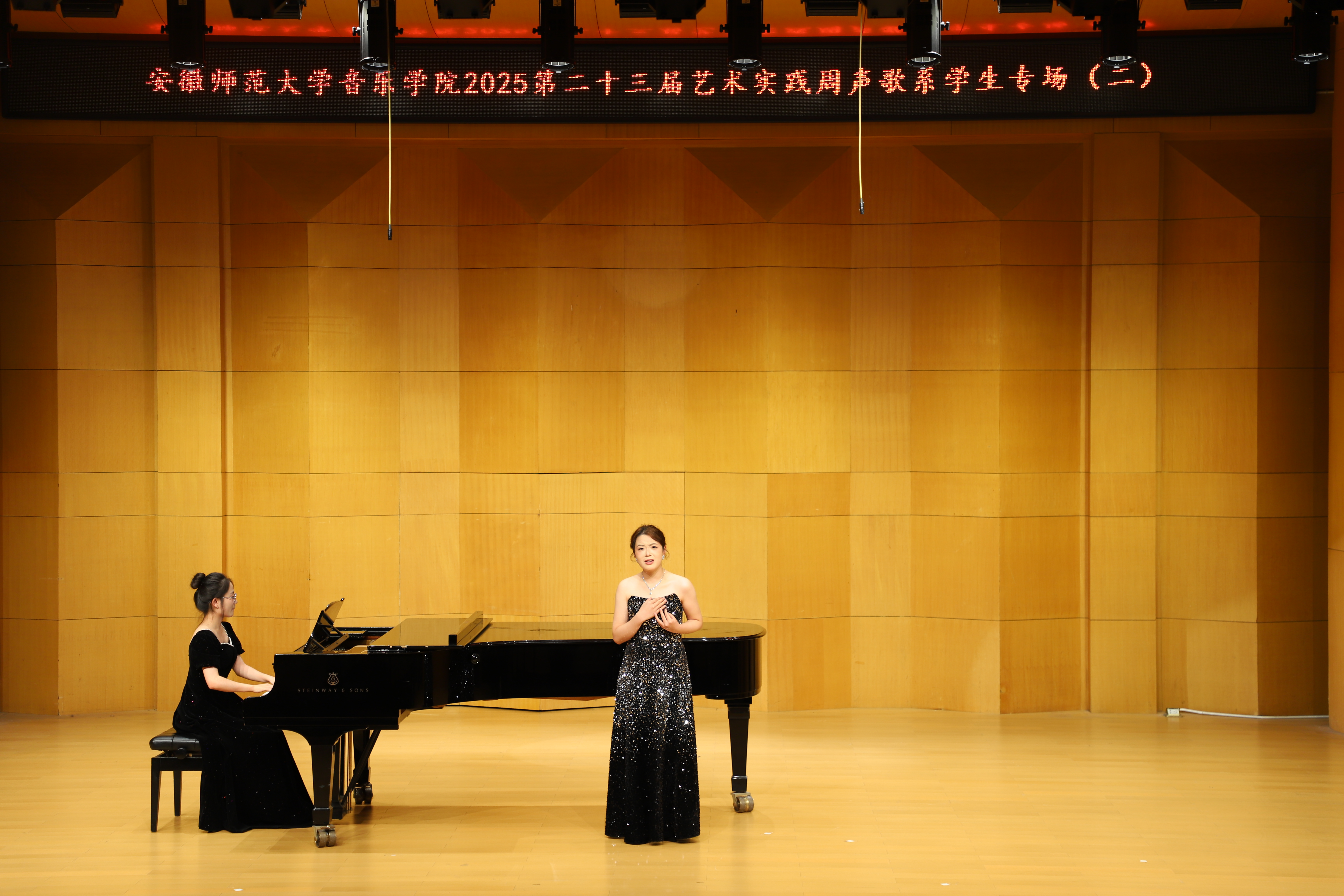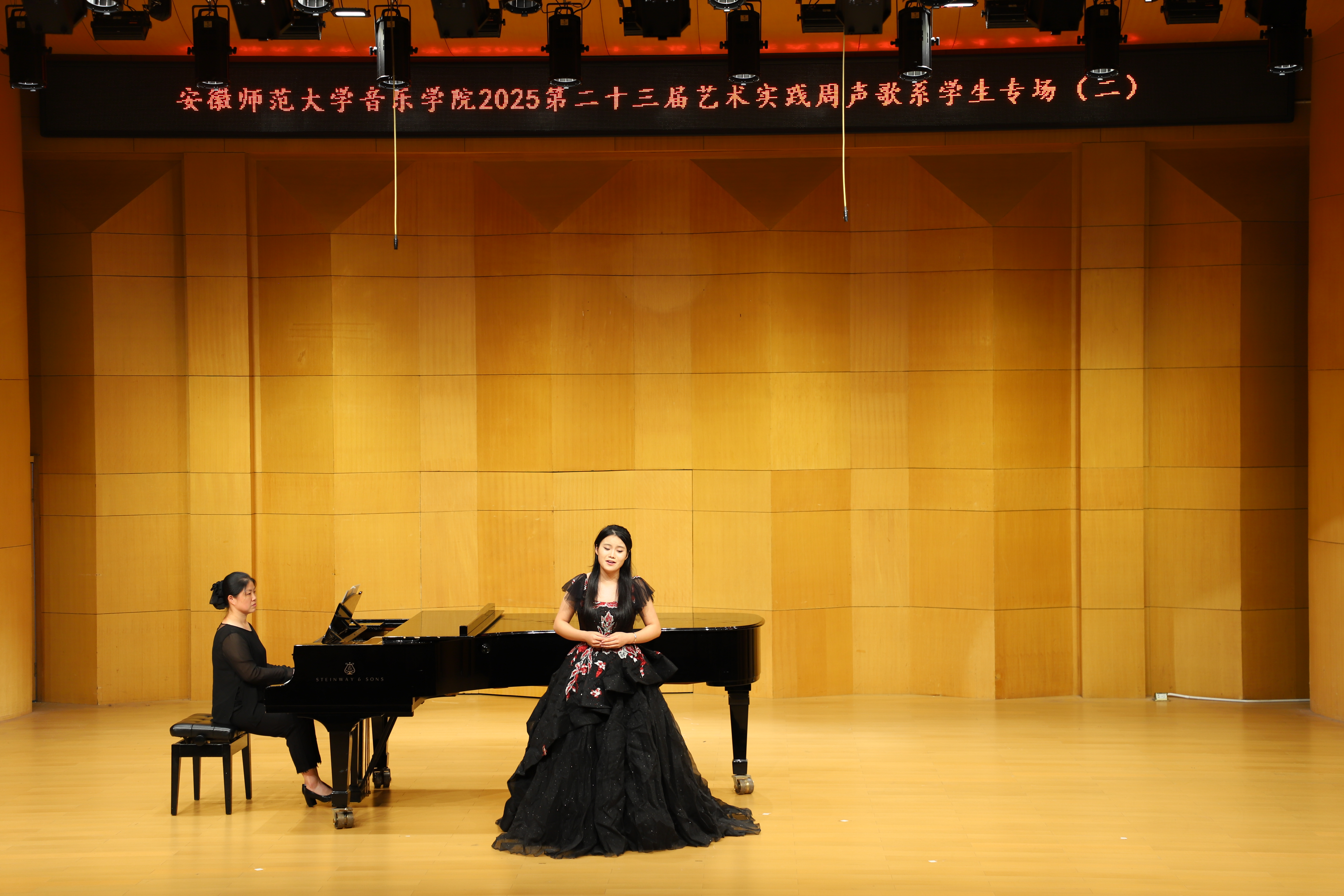 (本网讯 文/郭宇 图/许恺霖)10月13日晚,由公司声歌系举办员工声乐专场(二)圆满结束。本场音乐会由声歌系教师指导的23名2023级本科生出演。演唱歌曲体裁丰富,包括中国经典声乐作品《故土情》《蒹葭》,江苏民歌《拔根芦柴花》,外国艺术歌曲《请别忘了我》《多么可爱,多么美丽》,歌剧选段《像天使一样美丽》《人们叫我咪咪》等。