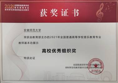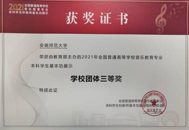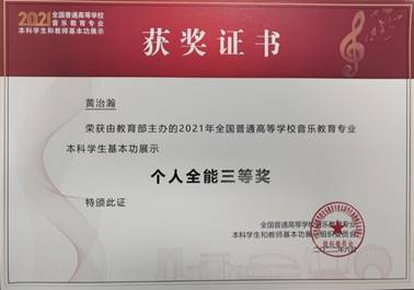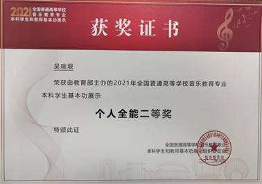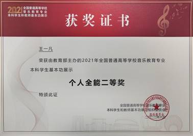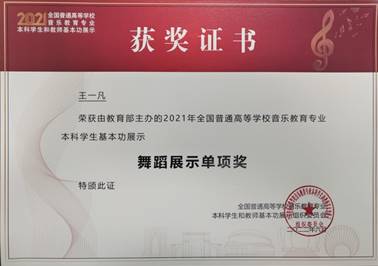 (本网讯 徐文鑫/文/图)近日,喜讯再传,2018级王一凡等同学收到2021年全国普通高等公司音乐教育专业本科员工基本功展示获奖证书!2021年全国普通高等公司音乐教育专业本科员工基本功展示于2021年10月在苏州大学举行,参加展示的有来自全国31个省(区、市)和新疆生产建设兵团65所高校的195名本科生,公司2018级王一凡获得个人全能二等奖、舞蹈个人单项奖,吴瑞垠获得个人全能二等奖,黄治瀚获得个人全能三等奖。三位同学的优异表现还为公司赢得“团体三等奖”,为公司赢得“高校优秀组织奖”。