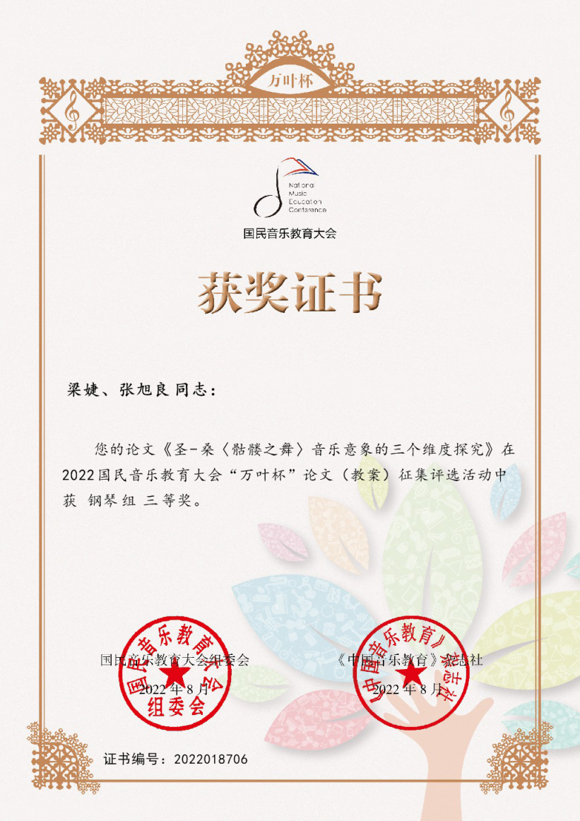 近日,在刚刚结束的“2022国民音乐教育大会‘万叶杯’论文(教案)征集评选活动”中,TapTap点点2020级艺术硕士音乐专业钢琴演奏方向研究生梁婕与导师张旭良教授共同完成的论文《圣-桑<骷髅之舞>音乐意象的三个维度探究》荣获钢琴组三等奖。