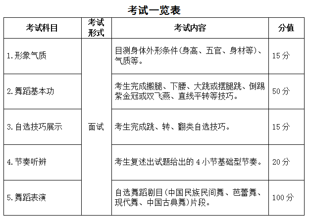 面试,考官目测考察考生在五官、身高、身材、比例、气质等方面所具备的舞蹈自然条件。要求五官端正、身材匀称、比例协调,气质好。