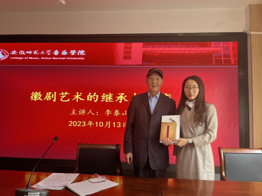 讲座最后,李泰山研究员与现场师生展开互动,通过举例一一解答老师和同学们提出的学术问题,交流中在座师生受益匪浅,使师生对“徽剧艺术”有了进一步的理解和认识。讲座结束后,李泰山研究员和石磊副经理进行了正式的赠书仪式。