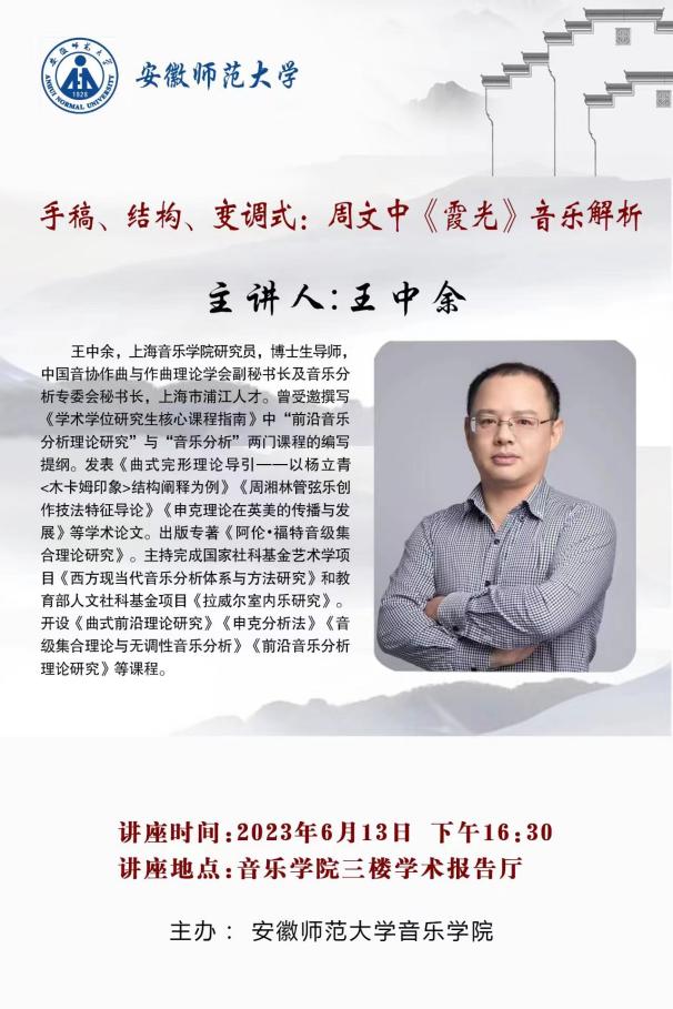 王中余在讲座缘起部分讲到,周文中先生创作的作品非常具有艺术价值,他本人对其作品手稿以及变调式深入研究,由此产生较为深刻地理解,随后进入本次讲座的主要内容,即以周文中《霞光》这部作品为例,通过创作背景、标题内涵及乐器编制等对其进行音乐解析。
