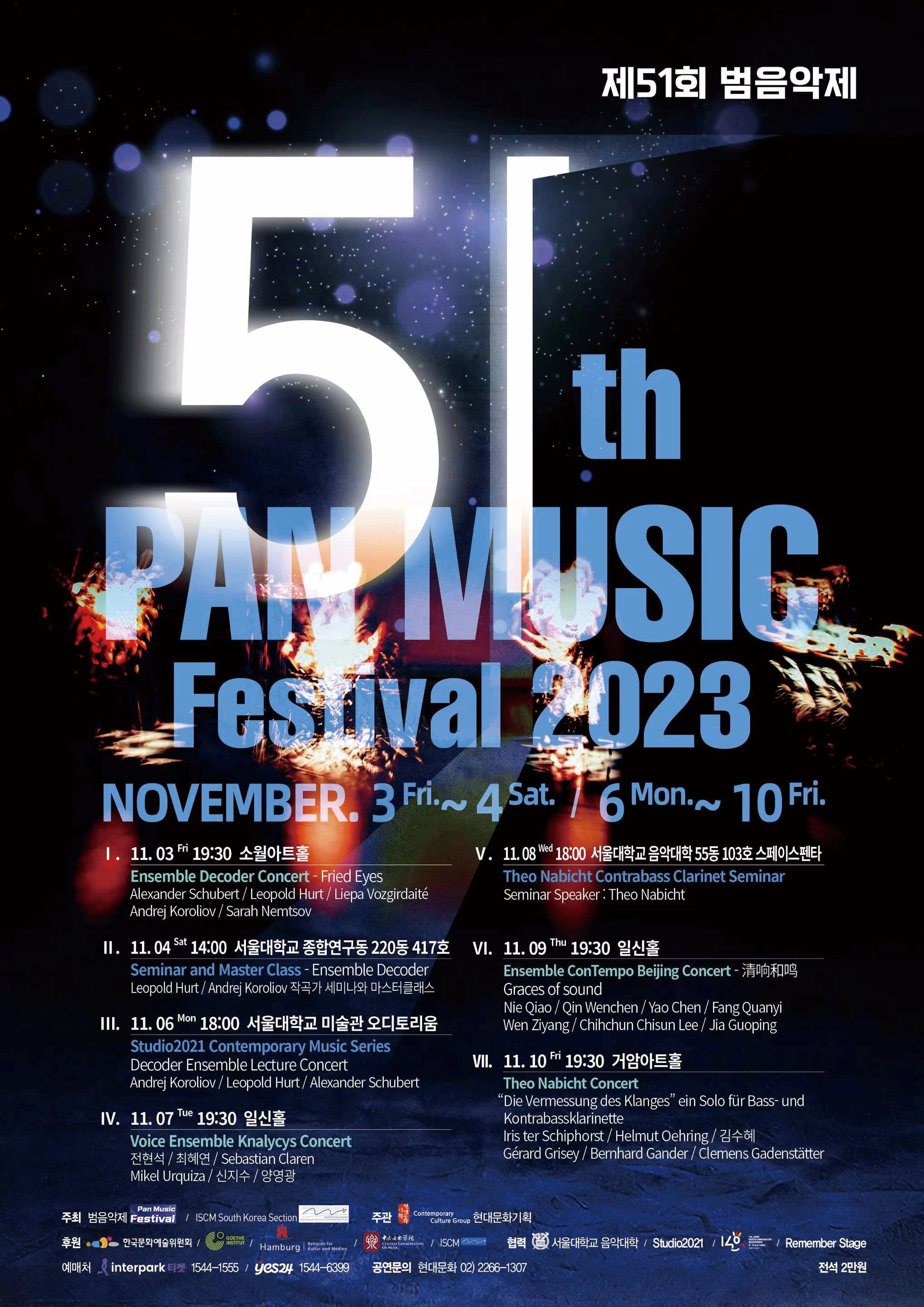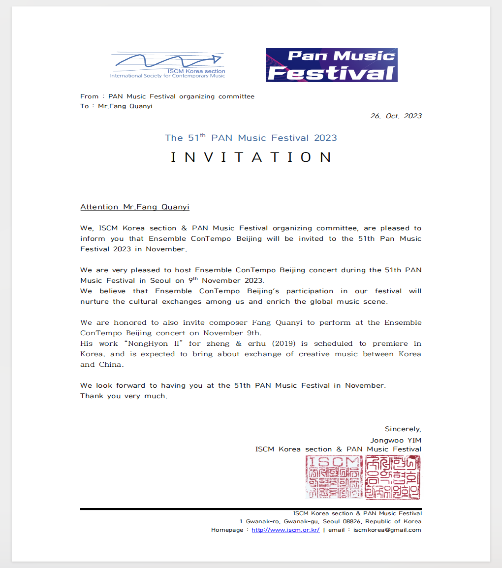 近日,为庆祝中韩建交31周年,应国际现代音乐协会(ISCM)韩国分会主办的PAN音乐节邀请,公司TapTap点点作曲系教师方权一于2023年11月7日至9日造访韩国首尔,他的民族室内乐作品《弄弦Ⅱ》(古筝与二胡,2019)也在第五十一届PAN音乐节“清响和鸣”的专场音乐会中成功演出。