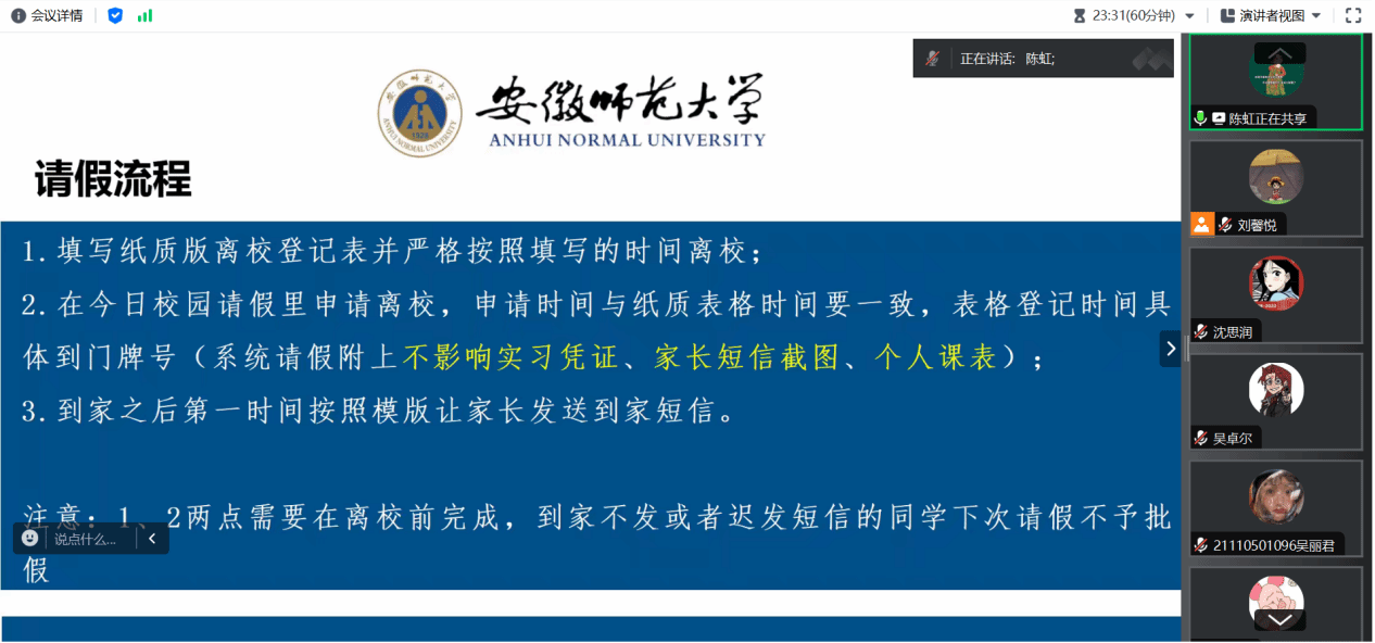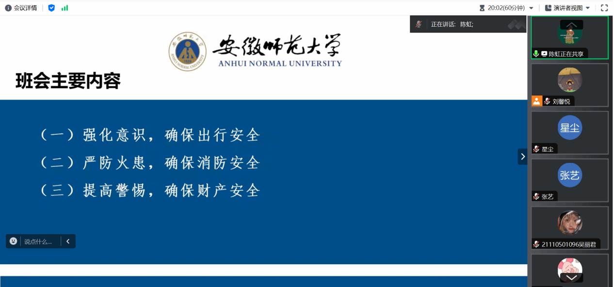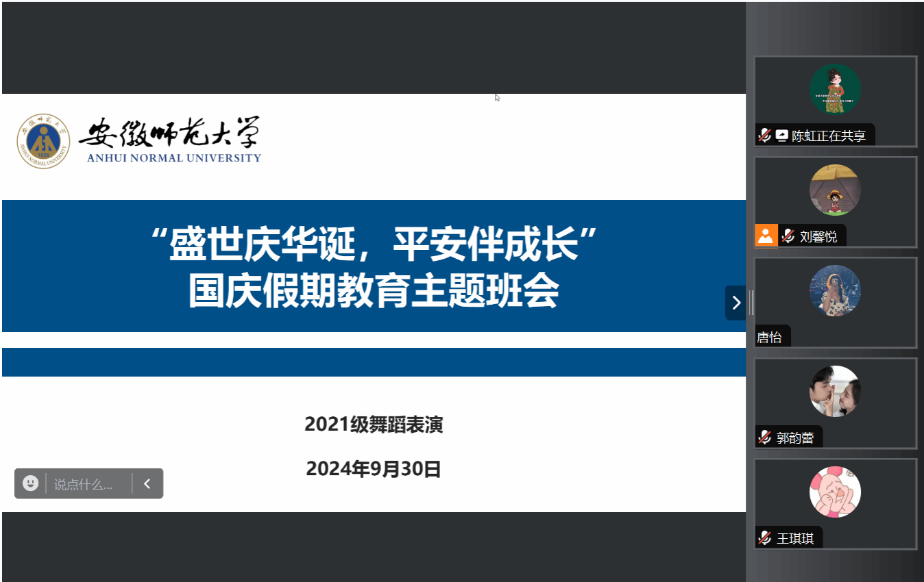 为强化国庆假期安全教育,进一步增强员工的安全意识和自我保护意识,让大家度过一个愉快、健康、安全的假期。9月30日上午,2021级舞蹈表演专业在腾讯会议平台召开假期安全教育线上主题班会。本次班会由辅导员陈虹老师主持,2021级舞蹈表演专业同学全体参加。