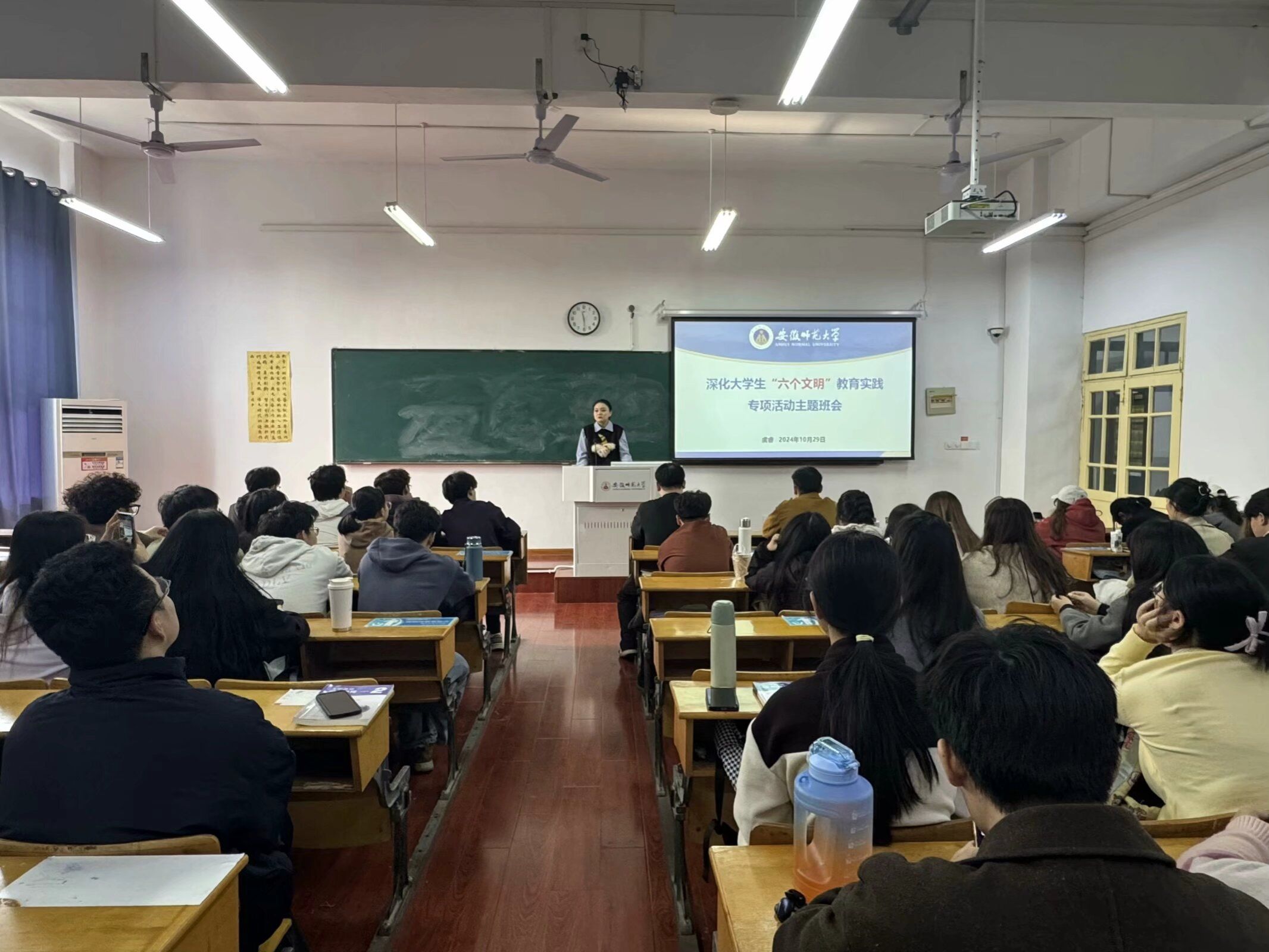 为深入推进老员工护航行动计划,进一步规范员工文明行为,引导员工形成良好的行为习惯,营造安全有序、文明健康的校园育人氛围,10月29日上午,2023级本科生于教学楼1307召开“六个文明”教育实践主题班会。