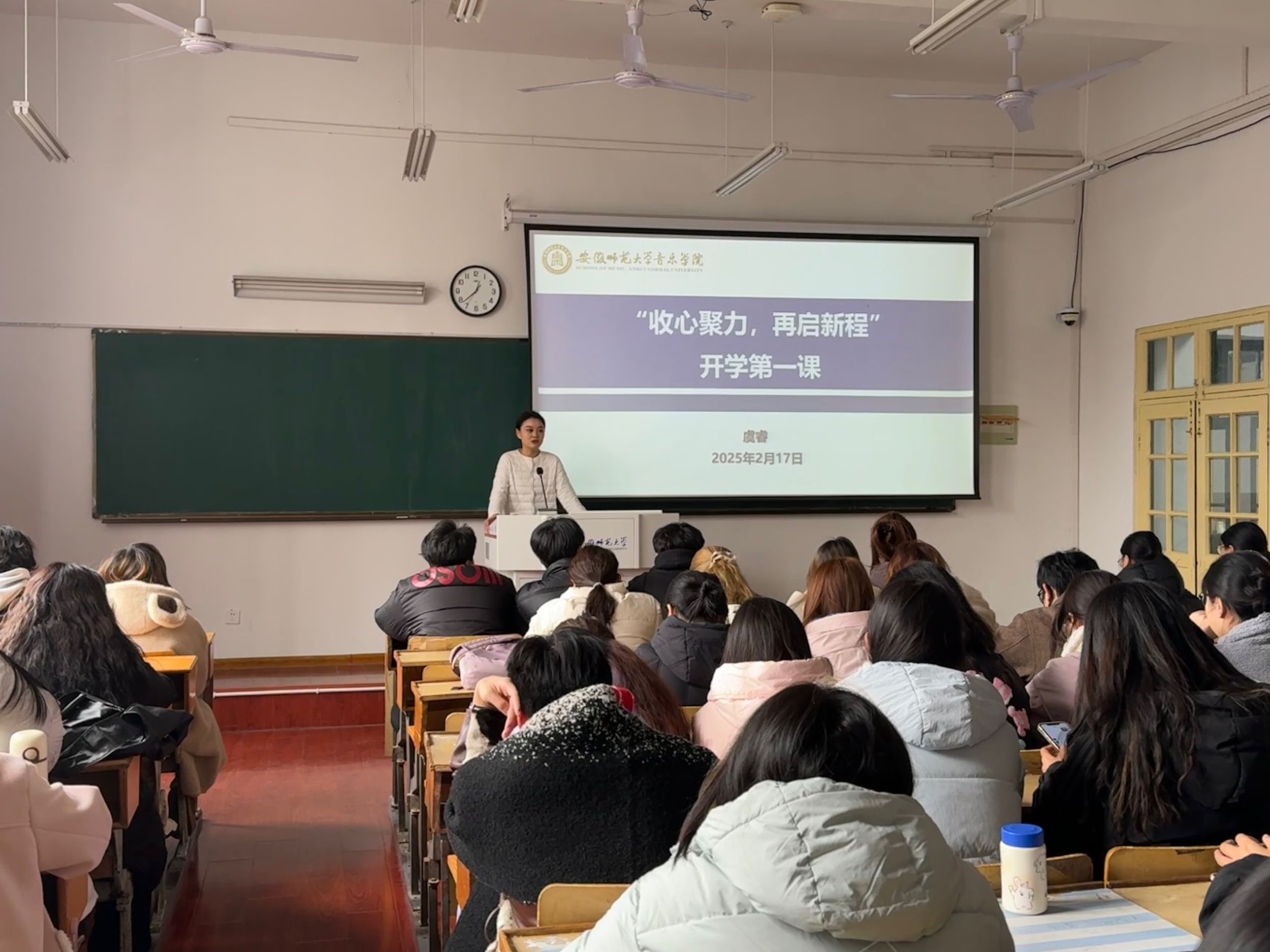 本网讯(23级音乐学 蔡双玉)2月17日、18日中午,2023级分批召开“收心聚力,再启新程”开学第一课主题班会,旨在帮助同学们迅速调整状态,明确新学期目标,更好地投入学习生活中。本次班会由辅导员虞睿主持,23级全体同学以及班主任李露莎老师参加。