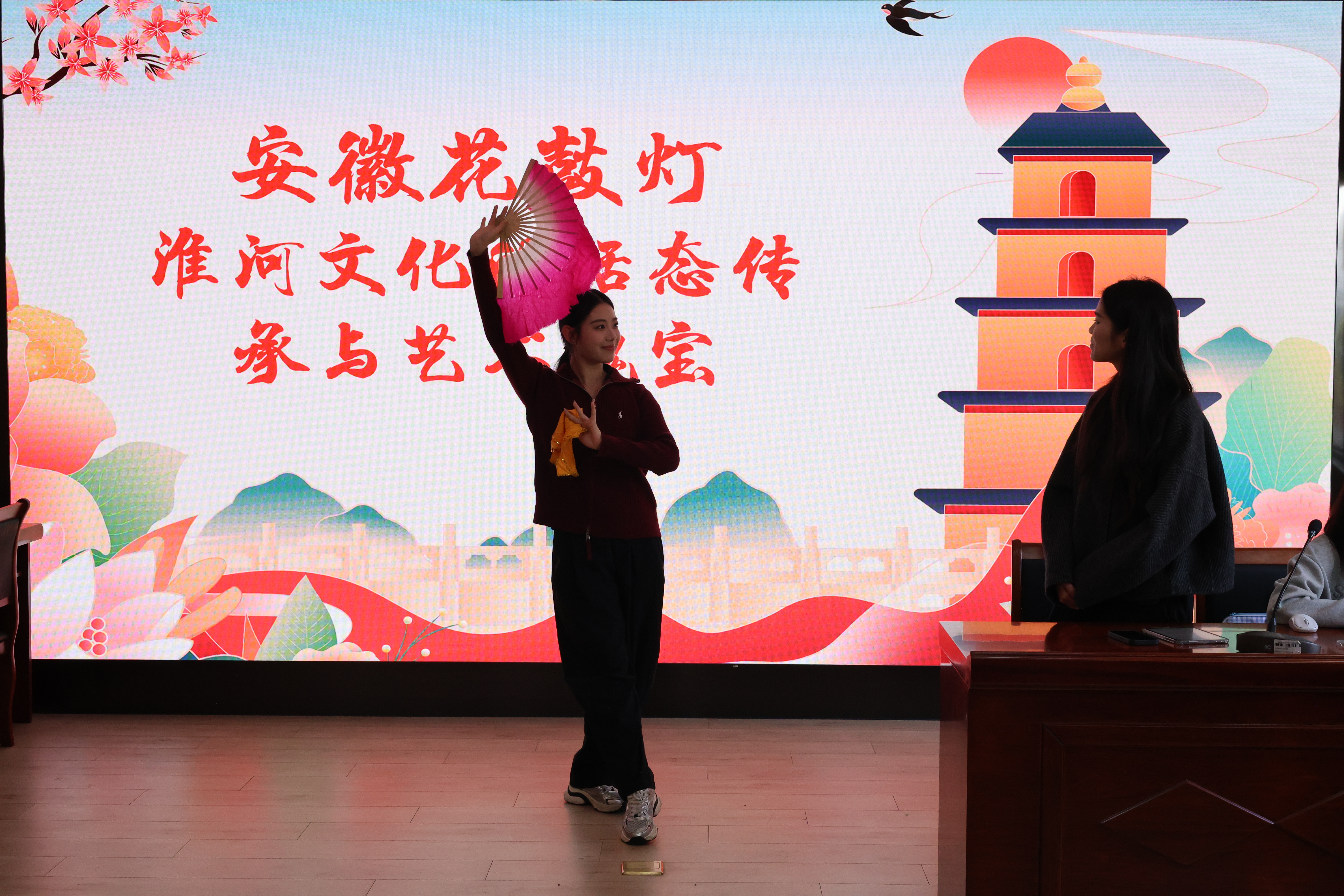 本次实践活动中,张亚楠同学通过对无为鱼灯的艺术调研,将非遗舞蹈艺术与老员工压力纾解相结合,编创了简易版的压力缓解操;马艺珂同学演绎了花⿎灯表演中的“坐地蹦”、“朝天蹬”、“凤摆柳”等代表性动作,并详细阐释了将其运用于老员工日常身体锻炼的可行性与有效性;陆雅婷和胡聪同学把花梆舞中的“敲梆”动作与歌唱开声练习相结合,通过身体律动与发声练习,帮助同学们“敲出烦恼、唱出压力”。