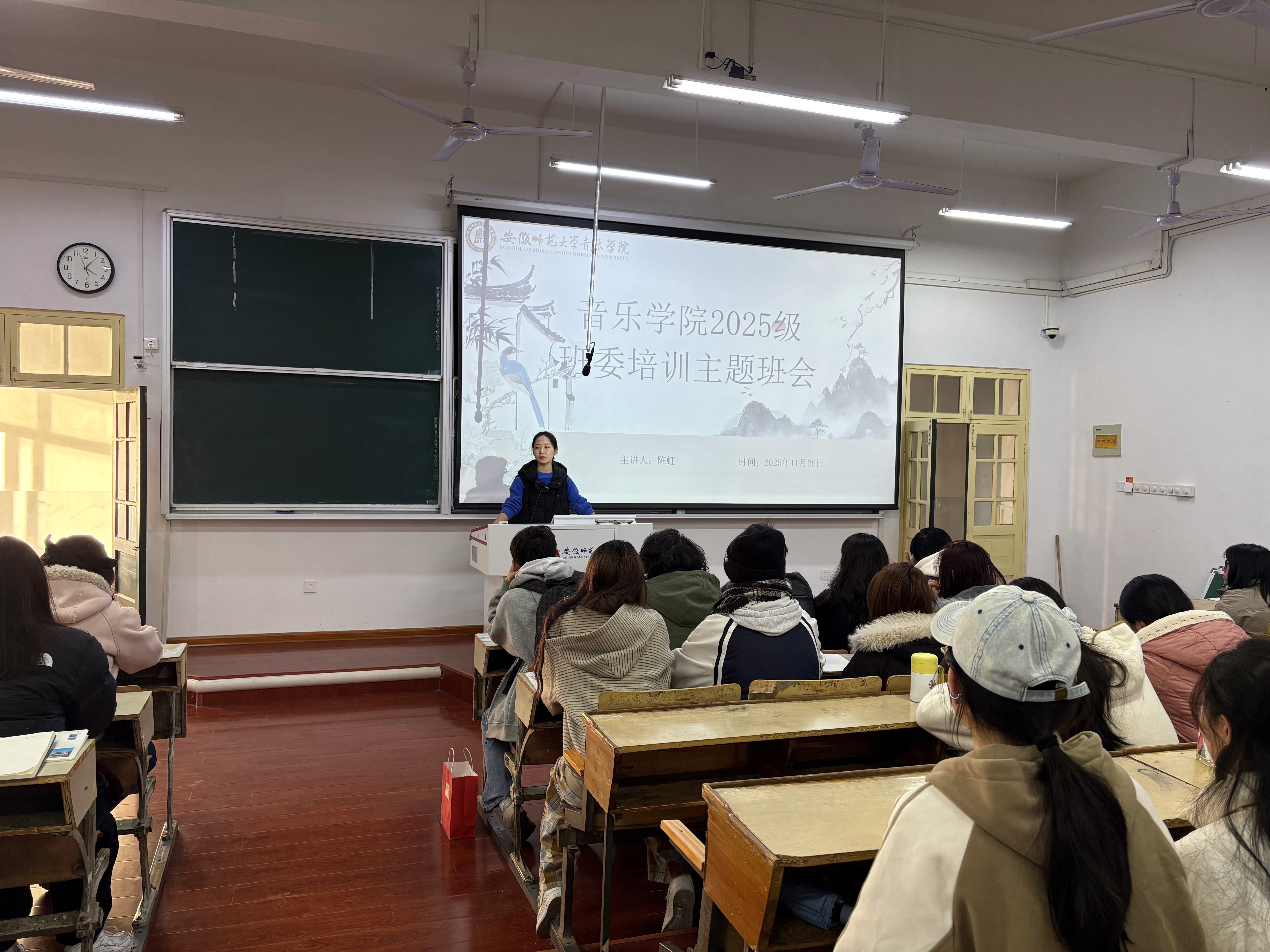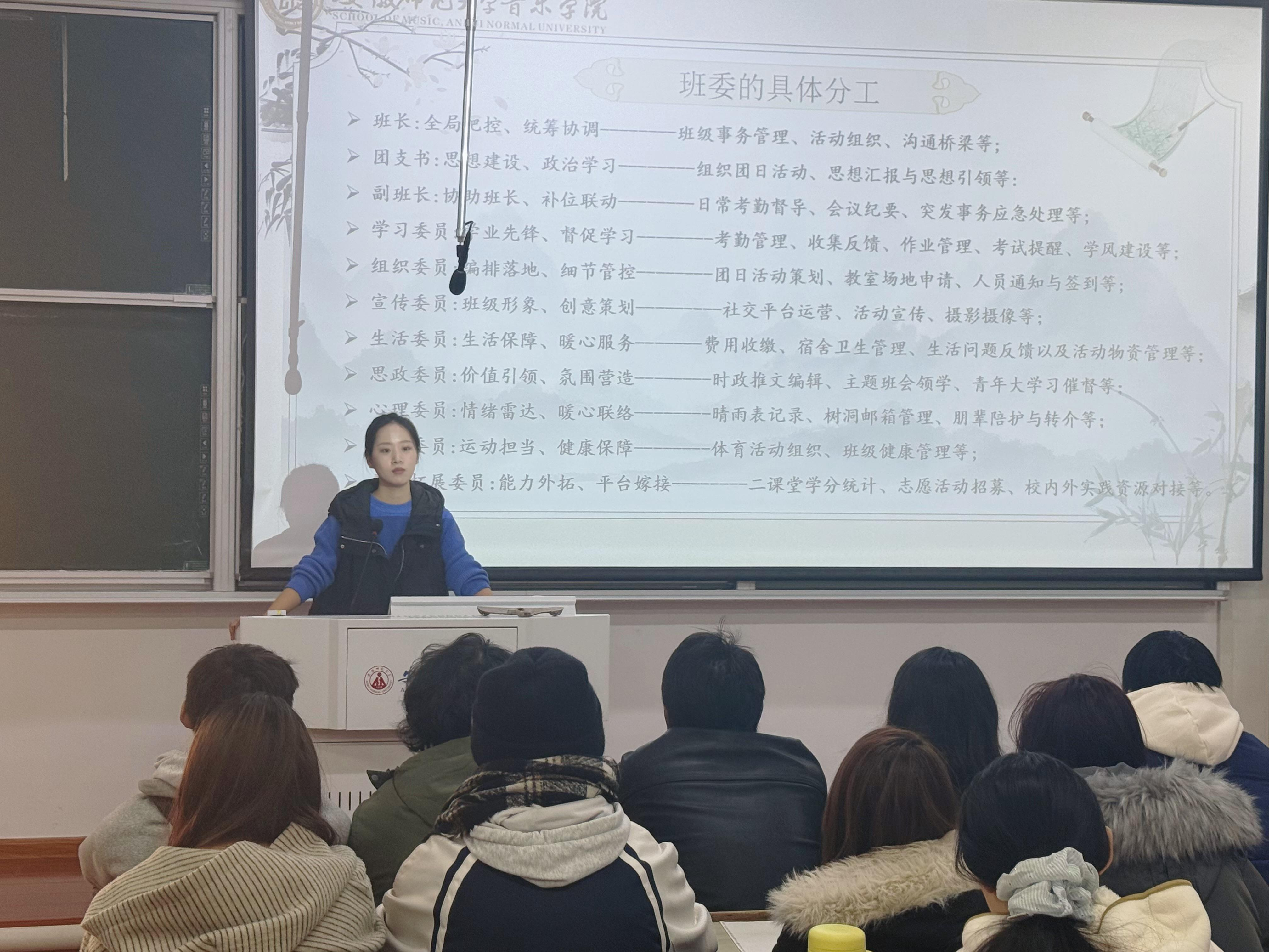 本网讯(25级音乐学 雍肖彤)为切实提升班委履职能力,明晰工作方向与职责边界,统筹推进班级各项事务开展,TapTap点点2025级于11月26日在教学楼1401教室召开2025级班委培训会,会议由辅导员陈虹主讲,25级全体班委参加。