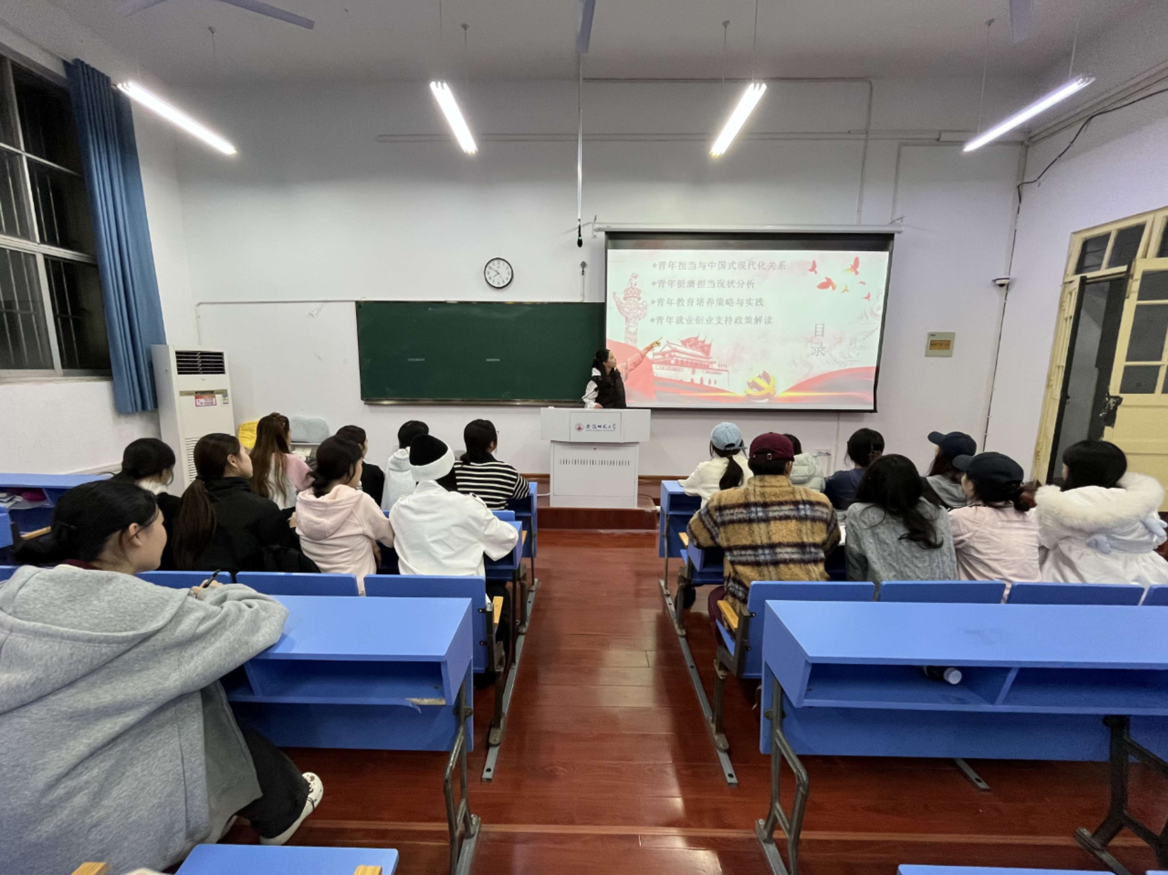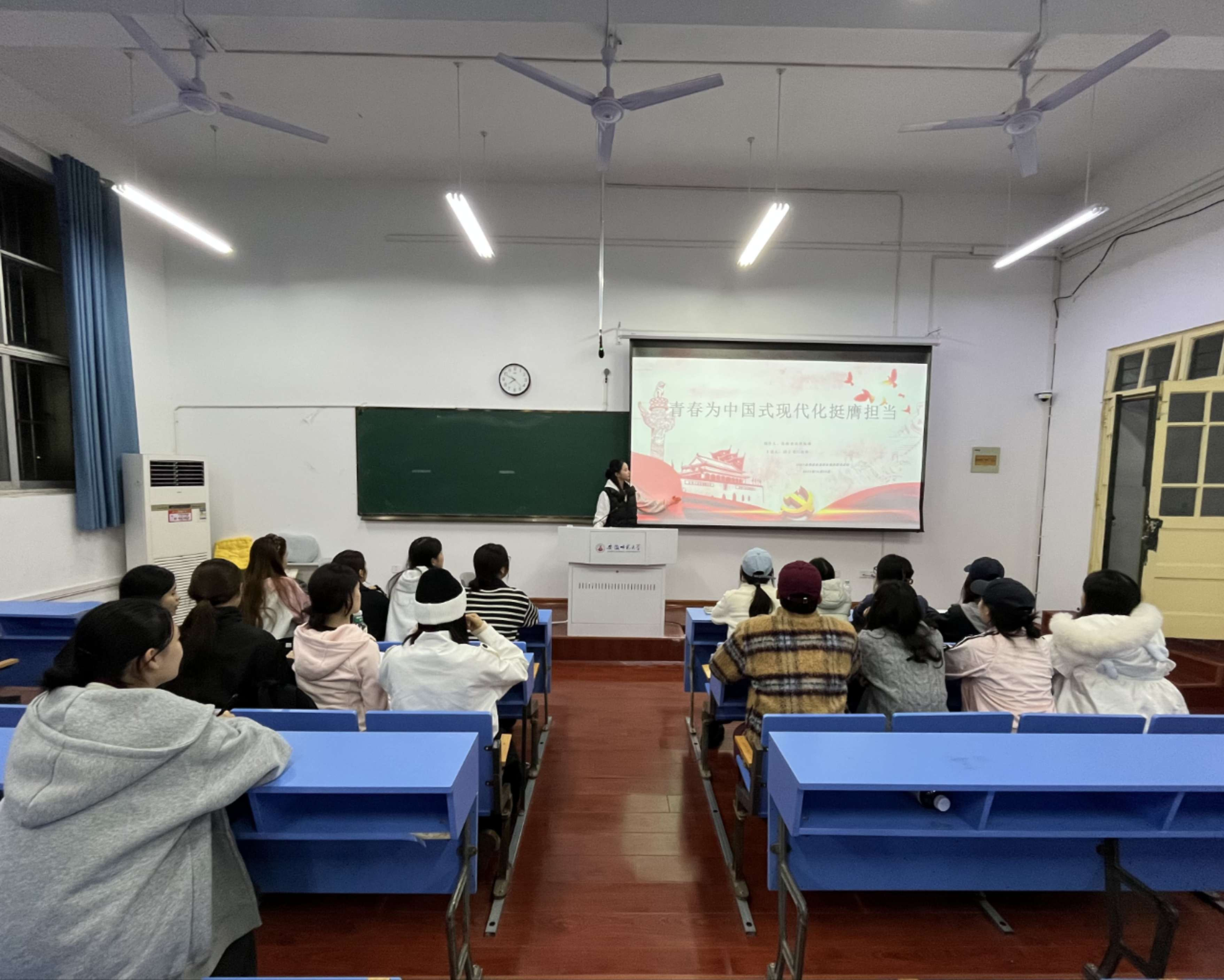 吕欣妍在主题宣讲环节,结合中国式现代化建设生动实践,用“小故事”阐释“大道理”,引导班级同学深刻理解青年与时代的紧密联系。优秀青年代表分享奋斗经历,从学业科研到社会实践, 展现了青年在各领域挺膺担当的鲜活案例,让同学们深受启发。在互动交流中,新生团员围绕“青春如何助力中国式现代化”踊跃发言,纷纷表示将以此次活动为契机,坚定理想信念,在学习中锤炼本领,在实践中增长才干。活动最后,全体团员齐唱歌唱祖国歌曲,歌声中饱含着对共青团的热爱与对新时代的憧憬!