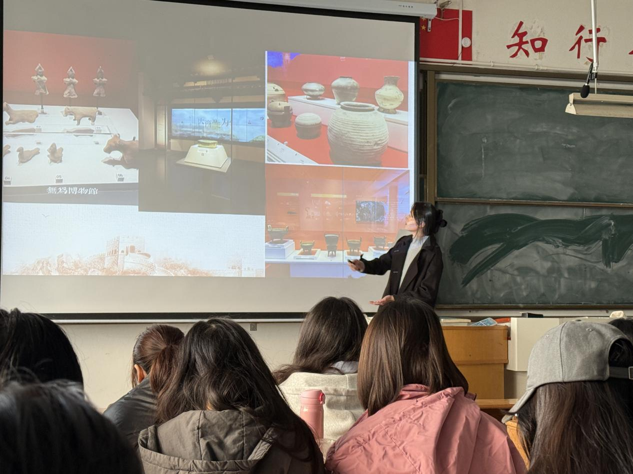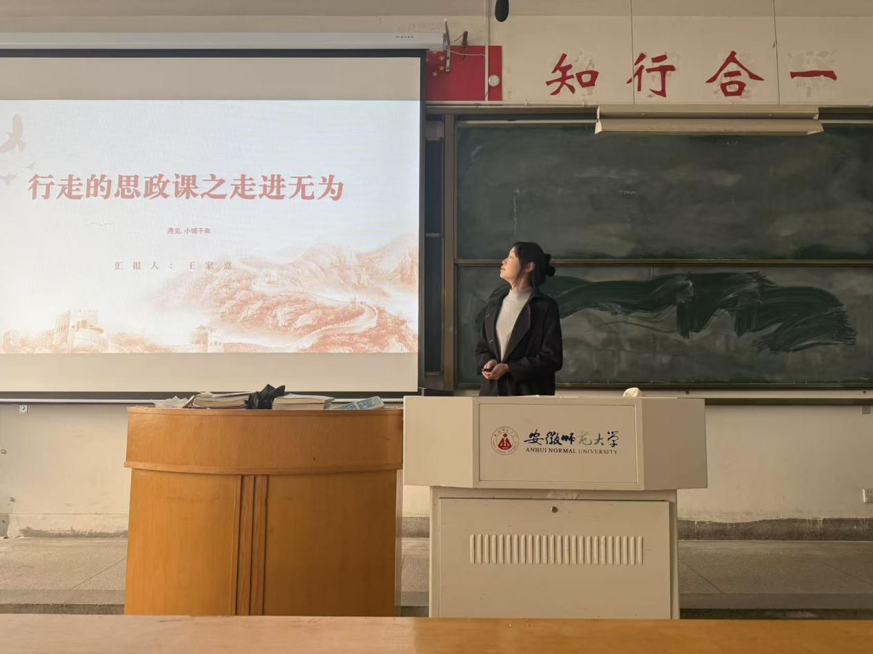 会上,思政委员王家嘉向全体同学汇报了参观无为博物馆的全过程。汇报围绕“历史底蕴”、“红色基因”与“时代新篇”三条主线展开。首先通过展陈照片,带领大家“云游览”了博物馆内承载千年文脉的历史文物,讲述了无为深厚的人文积淀,重点分享了在近现代史展厅的所见所感,通过一件件革命文物、一幅幅历史图片,生动再现了无为地区在党的领导下波澜壮阔的革命斗争史,特别是其在渡江战役等重大历史事件中的贡献,使同学们深切感受到红色江山的来之不易与革命先辈的坚定信仰。王家嘉同学还结合自身音乐专业背景,分享了如何从无为的历史变迁与建设成就中汲取艺术创作的灵感与动力。她谈到,作为新时代艺术学子,不仅要精进专业技能,更应主动从厚重的历史和火热的生活中寻找主题、获得灵感,思考如何用音乐语言讲述中国故事、传承红色精神、歌颂时代发展,实现个人艺术追求与服务社会发展的统一。
