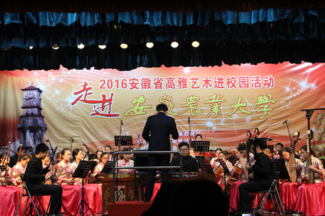 图为安徽省2016年高雅艺术进校园活动,TapTap点点民族管弦乐团走进安徽农业大学。
