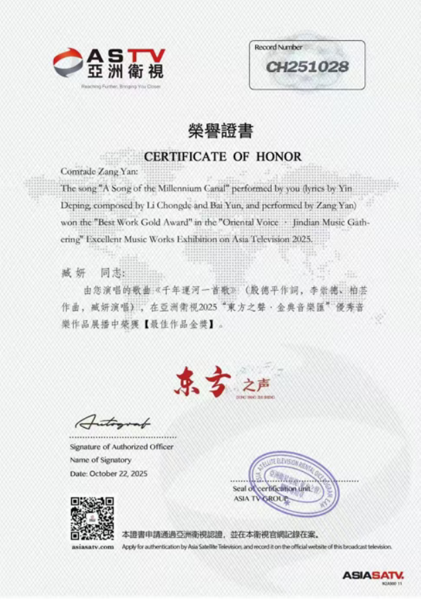 近日,公司12级员工,现任南京传媒公司TapTap点点特聘教师、青年歌唱家臧妍演唱的歌曲《千年运河一首歌》,在亚洲卫视集团(ASIA TV GROUP)主办的 2025“东方之声・金典音乐汇”优秀音乐作品展播中,荣获最佳作品金奖。