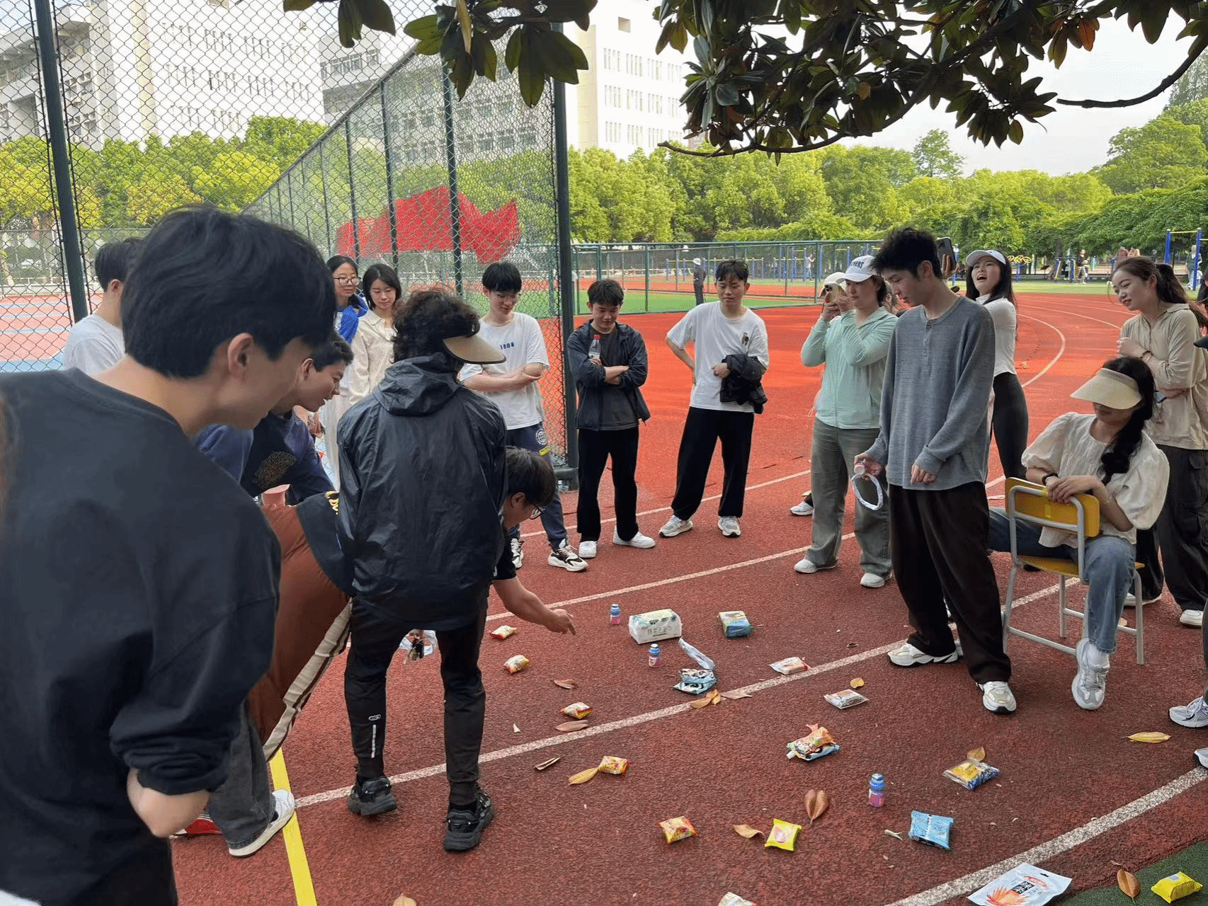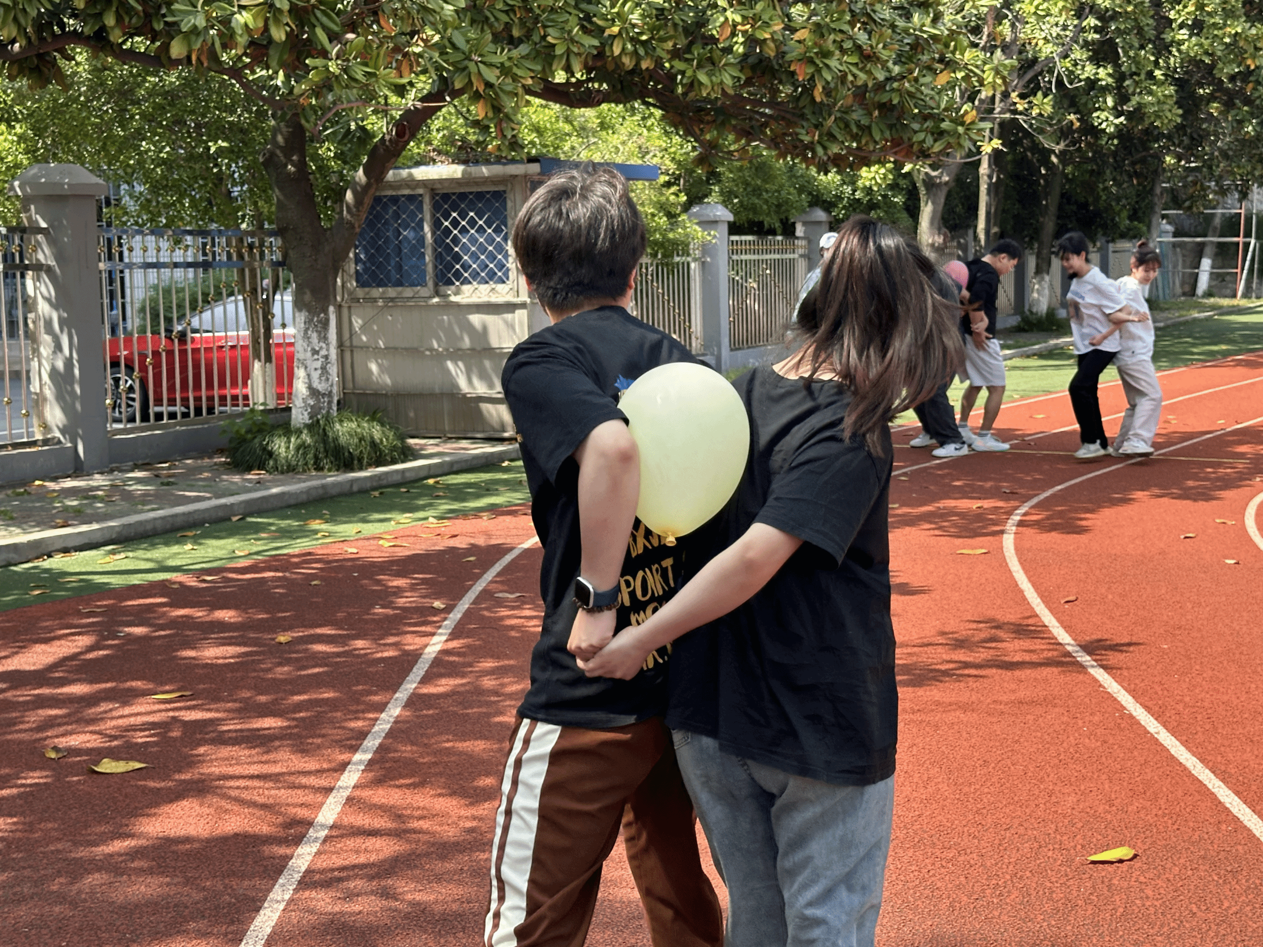 趣味运动会项目有“你比划,我来猜”、“背对背拥抱”、“抢占先机”、“你会跳绳吗?”、“甩掉‘烦恼’”五个比赛项目,以及一个娱乐项目“圈住‘lucky♥’”,同学们互相配合,有条不紊的进行。