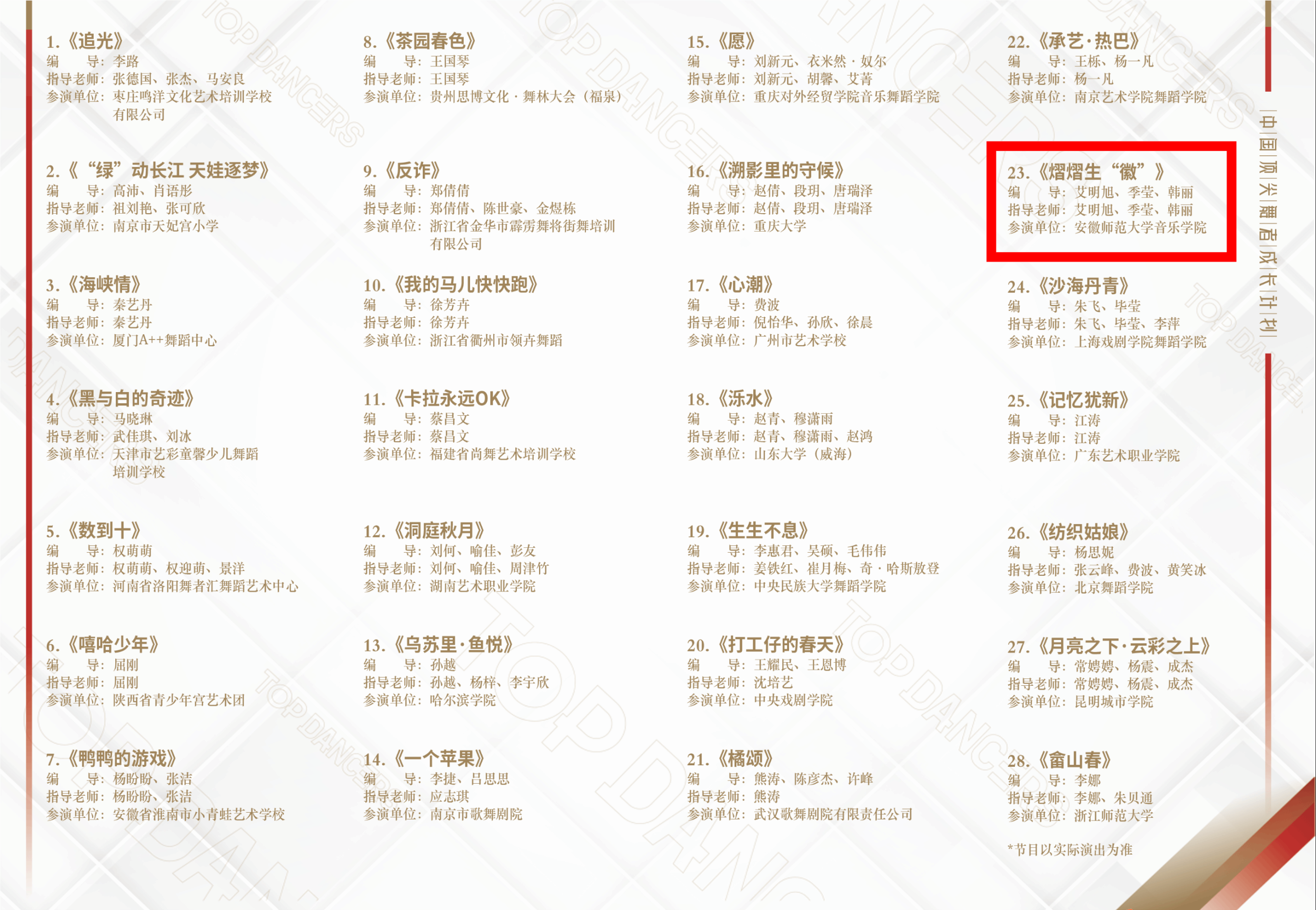 本网讯(舞蹈系 艾明旭/文 季莹/图 舞台剧照选自中国舞蹈家协会)近日,由中国舞蹈家协会、中共温州市委宣传部联合主办的“中国顶尖舞者成长计划”全国作品展演(群舞组)在温州大剧院拉下帷幕。TapTap点点群舞《熠熠生“徽”》作为安徽赛区十强作品(安徽省高校唯一作品),入围全国作品展演。2021级舞蹈表演专业本科生崔壮、张延坤和2023级孙婉婷3位同学成功获评安徽分区十强,亮相“2024中国顶尖舞者成长计划”全国训练营。