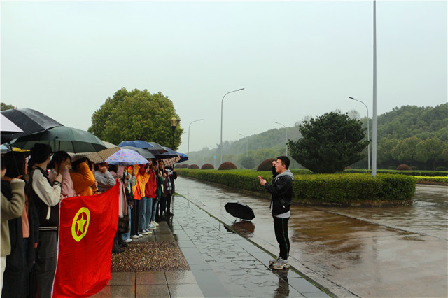 伴着铿锵有力的国歌,全体团员列队集合,共同哼唱。铿锵的旋律,嘹亮的歌声,渗透了细雨,团员们的自豪之情油然而生。