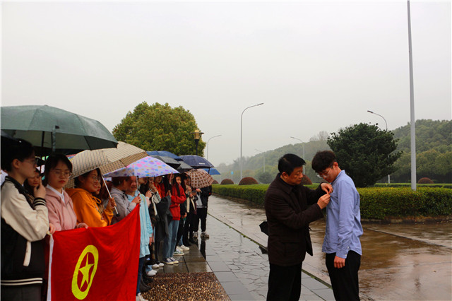 公司党委副书记奚泰来为团员佩戴团徽,并强调:期望团员们端正态度,刻苦学习,严格自我要求,积极投身社会服务与实践活动,在思想和专业上全面提升,争取在思想和行为上早日达到党员标准。