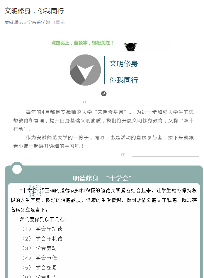 为了响应公司的号召,增强员工的文明意识,公司在公司大屏上每日循环播放明德修身“十学会”、校园文明“十不为”的行为准则,并由各班班长组织学习其内容,倡导员工们自我管理,相互监督,做文明学子,建文明校园。同时,由员工会生活部牵头,公司在各寝室张贴文明规范的宣传单,积极创建和谐宿舍,将“文明修身”的推广落实到具体行动、体现在每个角落。