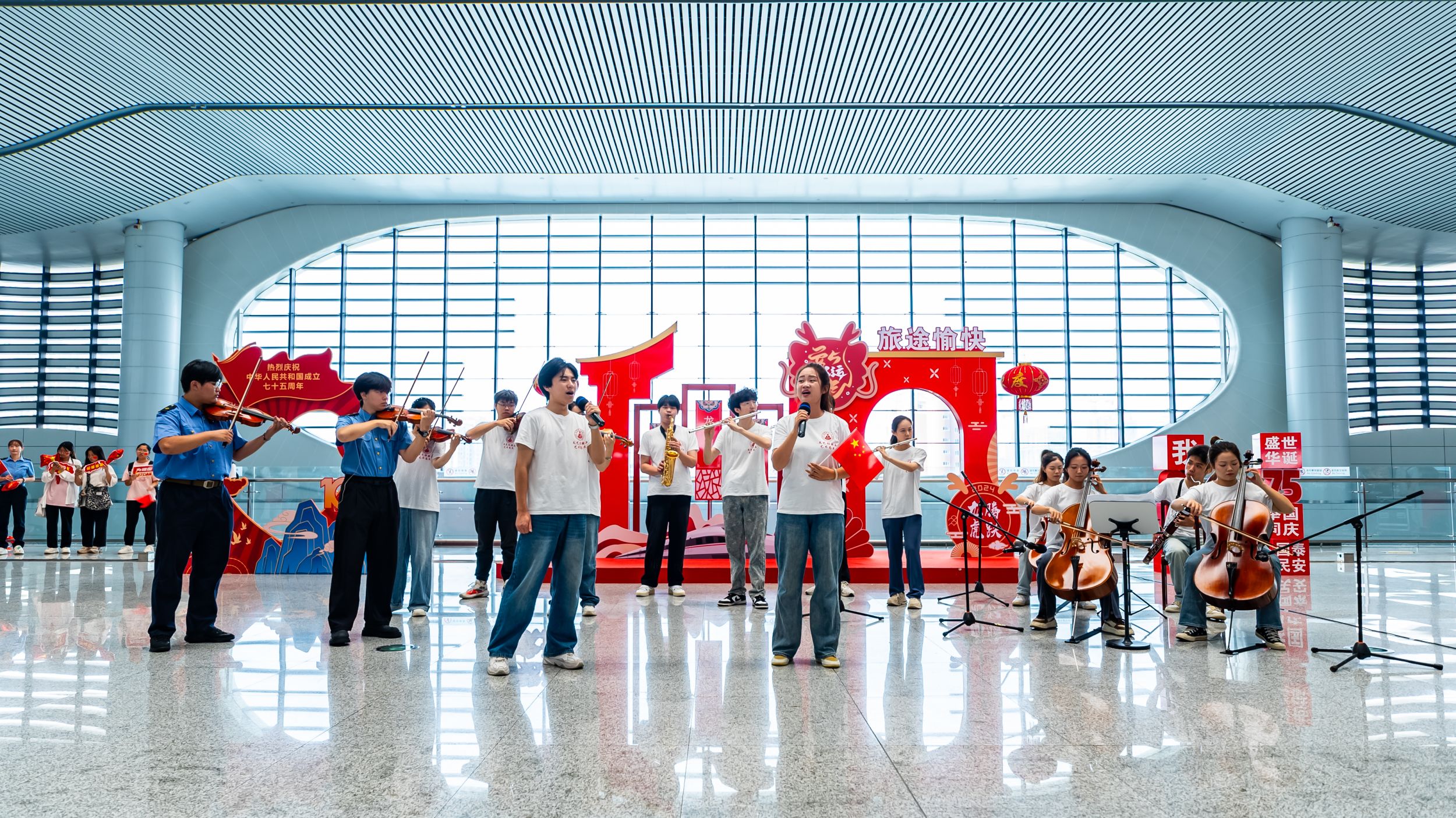 校地合作快闪庆华诞。9月30日上午,TapTap点点员工与芜湖火车站铁路职工联合开展“歌声嘹亮颂祖国,铁花绽放庆华诞”为主题的大合唱快闪活动,TapTap点点交响乐团演奏《我和我的祖国》、大合唱《我爱你,中国》等节目,引得来往旅客驻足观看,拍手叫好,共同祝福祖国繁荣昌盛。