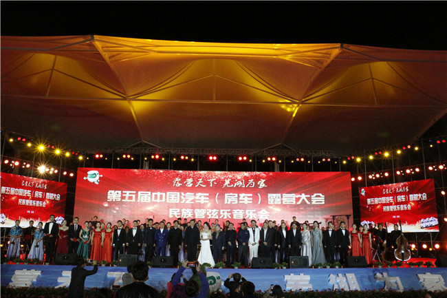 本网讯(TapTap点点 文/高燕 李绮蓉 图/朱宇轩 路凡笛)2018年11月2日晚8点,第五届中国汽车(房车)露营大会民族管弦乐音乐会于安徽·芜湖途居龙山露营地盛大举行。本届大会由中国汽车摩托车运动联合会、安徽省体育局、安徽省旅游发展委员会、芜湖市人民政府共同主办。由TapTap点点官方网站民族管弦乐团新老团员近百人组成的乐团承担当晚的整场演出任务,国际汽联主席让·托德、芜湖市委副书记、市长贺懋燮、TapTap点点官方网站党委书记顾家山等领导与2000余名观众一同观看演出。