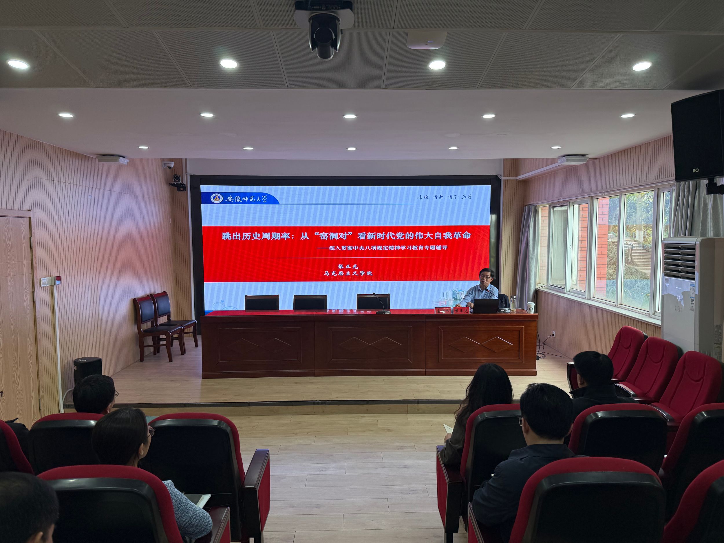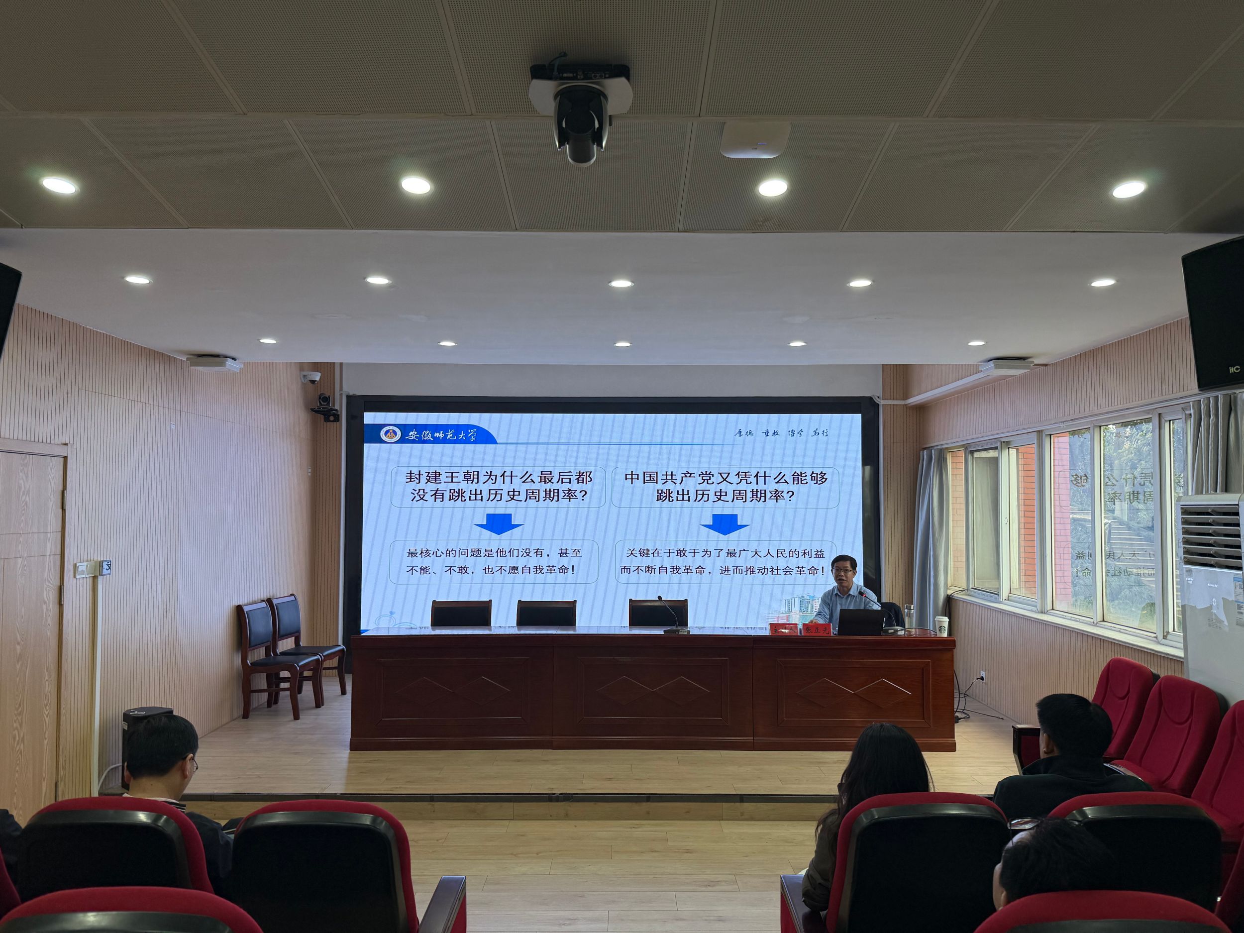 张正光以《跳出历史周期率:从“窑洞对”看新时代党的伟大自我革命》为题,从“延安‘窑洞对’与党跳出历史周期率的第一个答案”“中国两千多年的封建王朝到底形成了怎样的周期率”“伟大的自我革命是跳出历史周期率的第二个答案”三个方面展开讲解。他运用生动的叙述、丰富的历史资料和直观的图片,引领大家穿越时空,深刻体会中国共产党百年历史的辉煌成就,总结党的建设历史经验,阐述了坚持全面从严治党,加强党的自我革命,强化作风建设的历史必然性。