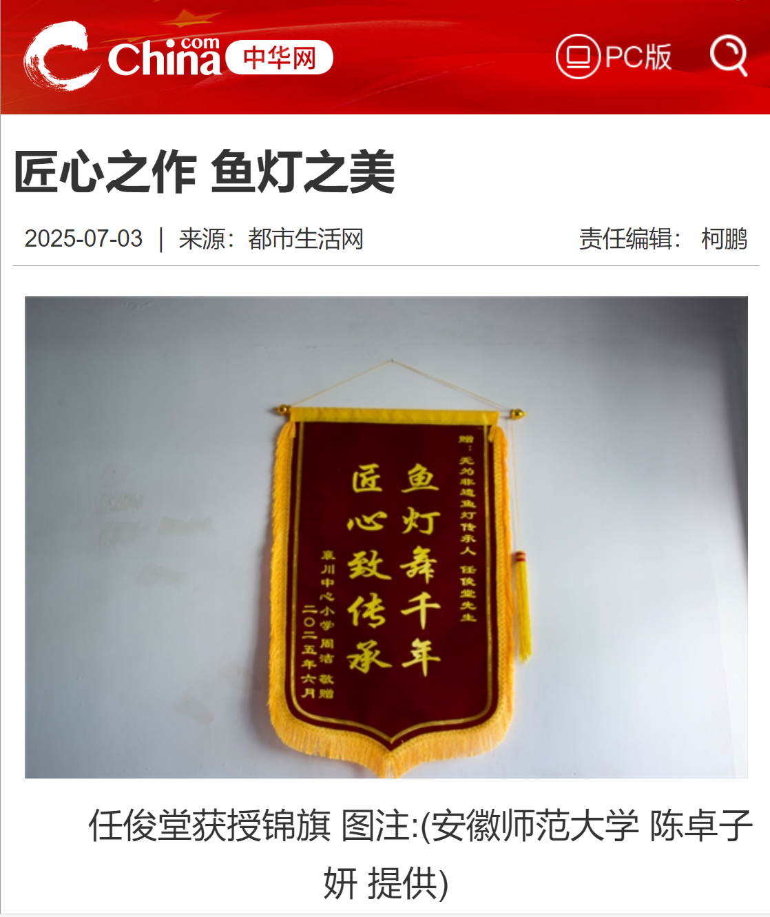 7月2日,调研团队走进国家级非物质文化遗产传承人任俊堂先生的住所,开启了一场沉浸式的非遗探索之旅。7月5日,调研团队在非遗鱼灯传承人蒋章老师的带领下,抵达任氏祠堂。蒋老师现场示范了鱼灯舞的经典阵法“八鱼戏水”“金钩挂月”,只见他手持鱼灯,步伐矫健,鱼灯在他手中穿梭嬉戏、盘旋跳跃,令人目不暇接。团队前往当地公司,采访了无为鱼灯社团的四位员工代表。员工们纷纷表示,在社团中不仅学会了鱼灯制作的步骤,更懂得了每一道工序背后的文化内涵。非遗不再是书本上的遥远符号,而是可以触摸、感受的鲜活技艺。员工们说:“每次拿起工具,都感觉在和古老技艺对话,非遗文化让我们收获了成长与感动。”