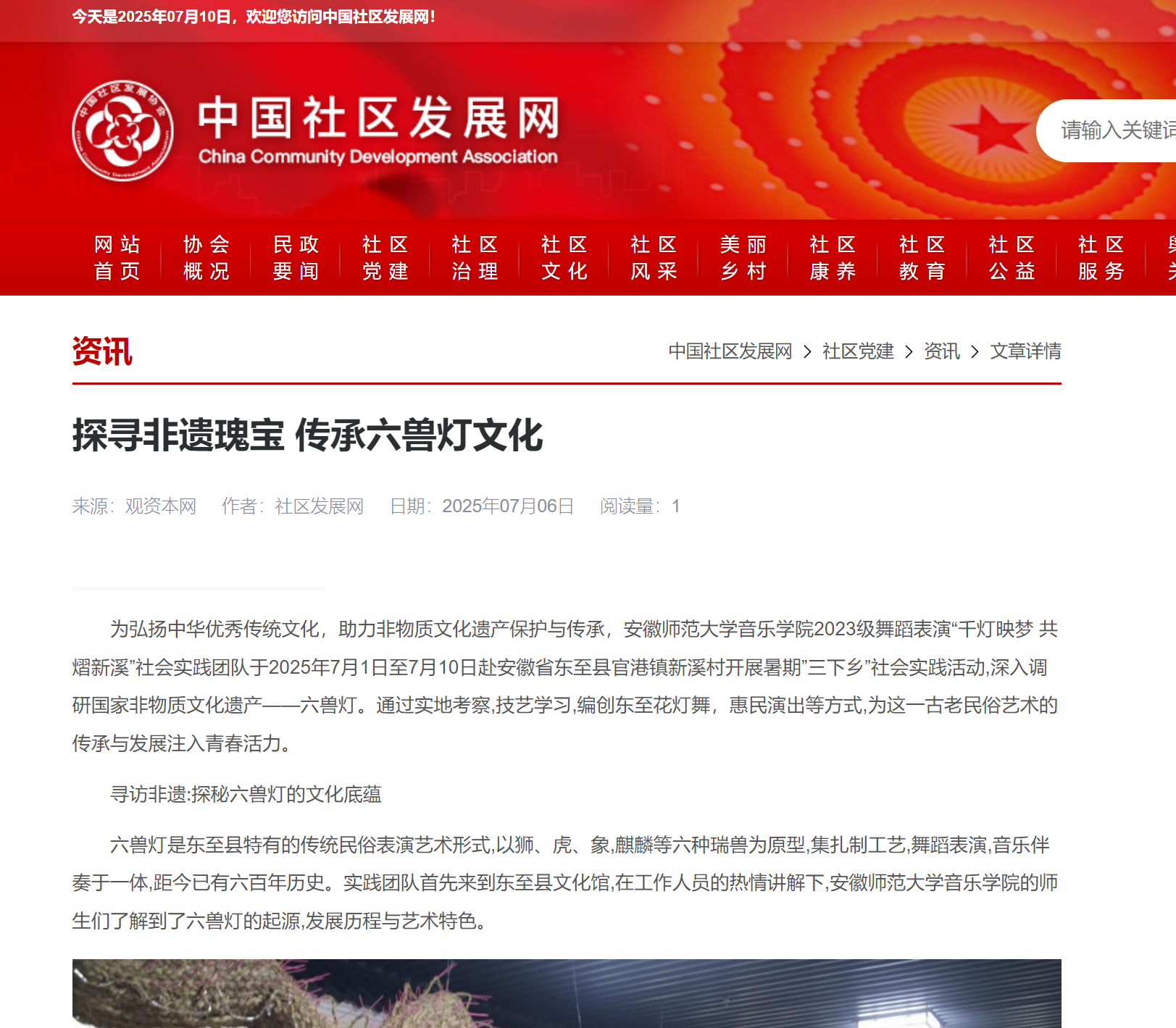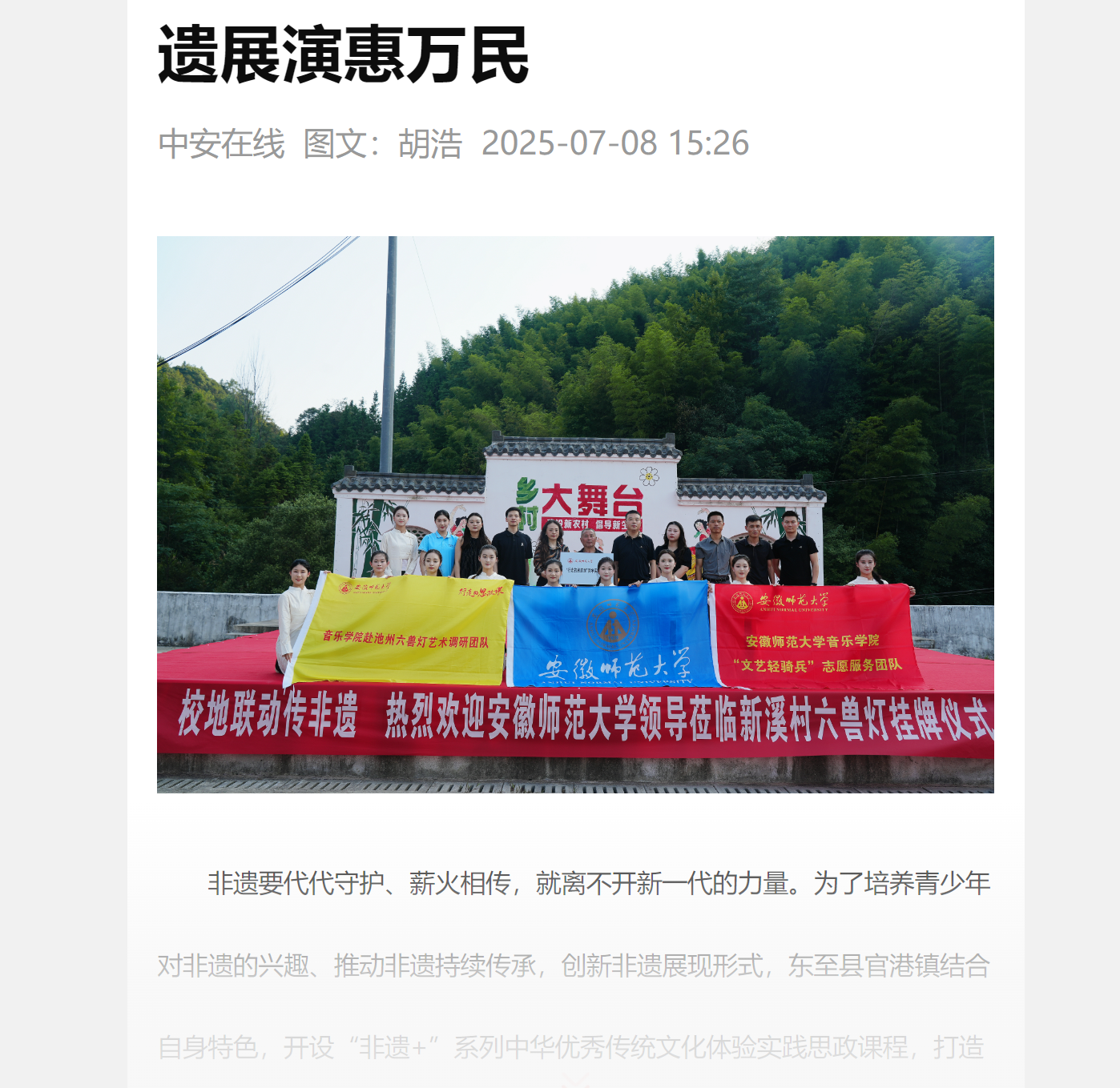 近年来,东至县官港镇党委、政府高度重视非遗保护传承工作。通过举办大型非物质文化遗产汇演、引导高校社会实践、对接各级媒体宣传、组织非遗项目巡展等方式,线上线下、县内县外协同发力,全方位提升“六兽灯”等非遗项目的知名度和影响力。此次高校师生的深度调研,不仅彰显了青年一代对中华优秀传统文化的热忱与担当,也为“六兽灯”的保护、研究与活化注入了新活力,提供了新视角。
