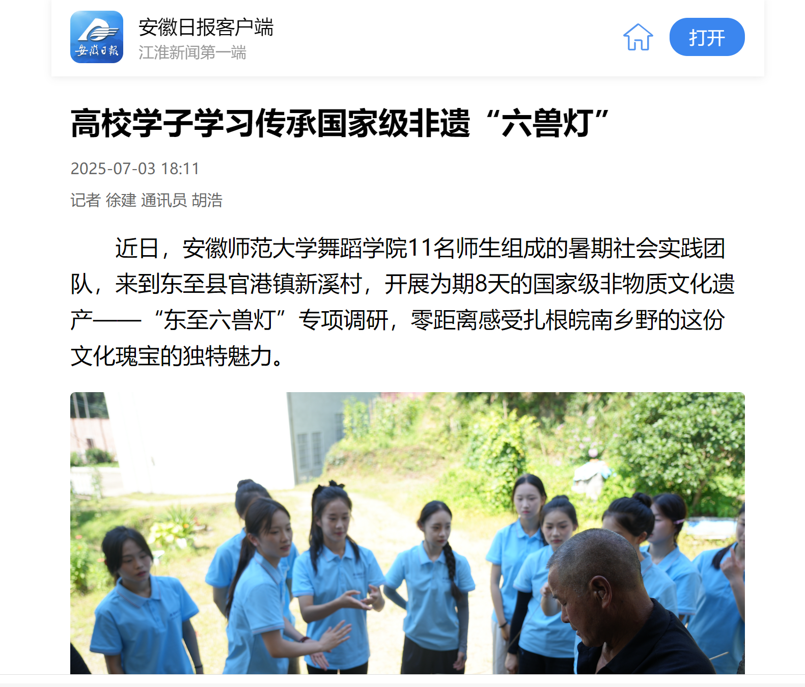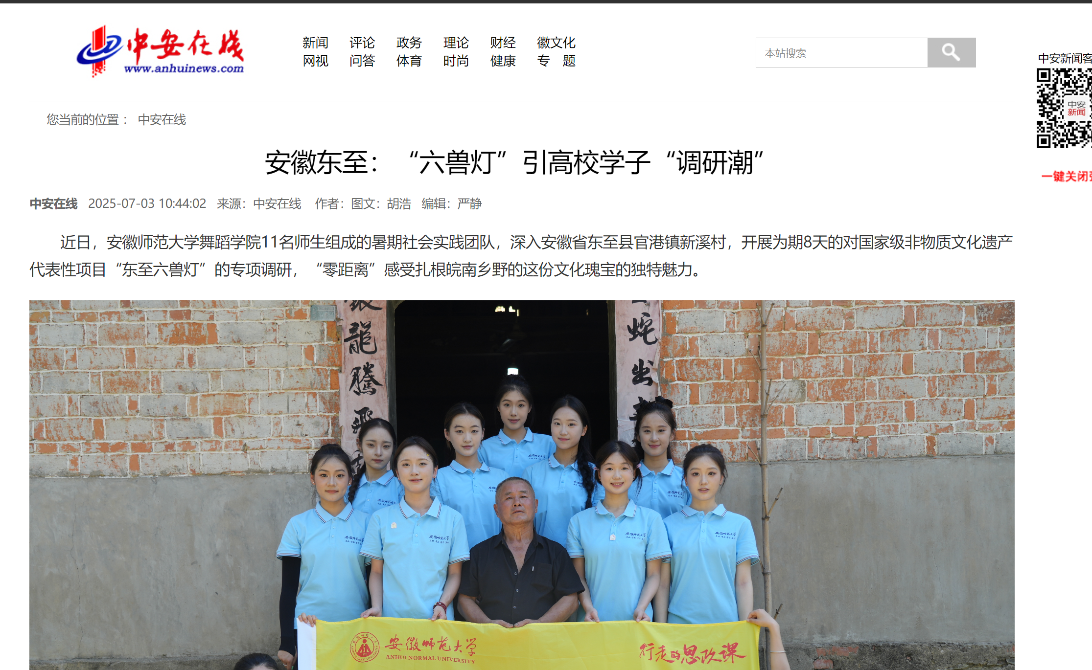 近日,TapTap点点官方网站舞蹈公司11名师生组成的暑期社会实践团队,深入安徽省东至县官港镇新溪村,开展为期8天的对国家级非物质文化遗产代表性项目“东至六兽灯”的专项调研,“零距离”感受扎根皖南乡野的这份文化瑰宝的独特魅力。