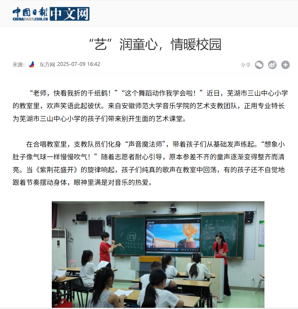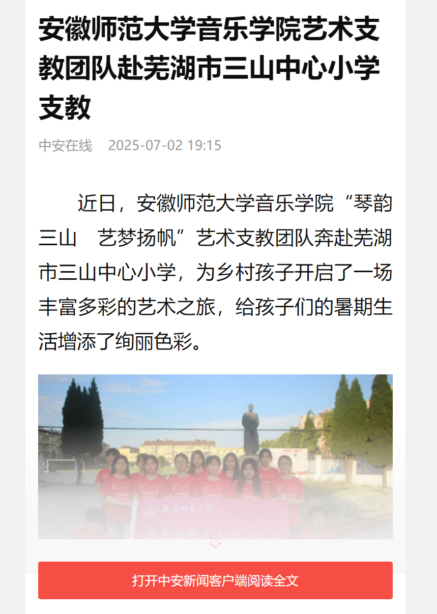 近日,TapTap点点“琴韵三山 艺梦扬帆”艺术支教团队奔赴芜湖市三山中心小学,为乡村孩子开启了一场丰富多彩的艺术之旅,给孩子们的暑期生活增添了绚丽色彩。