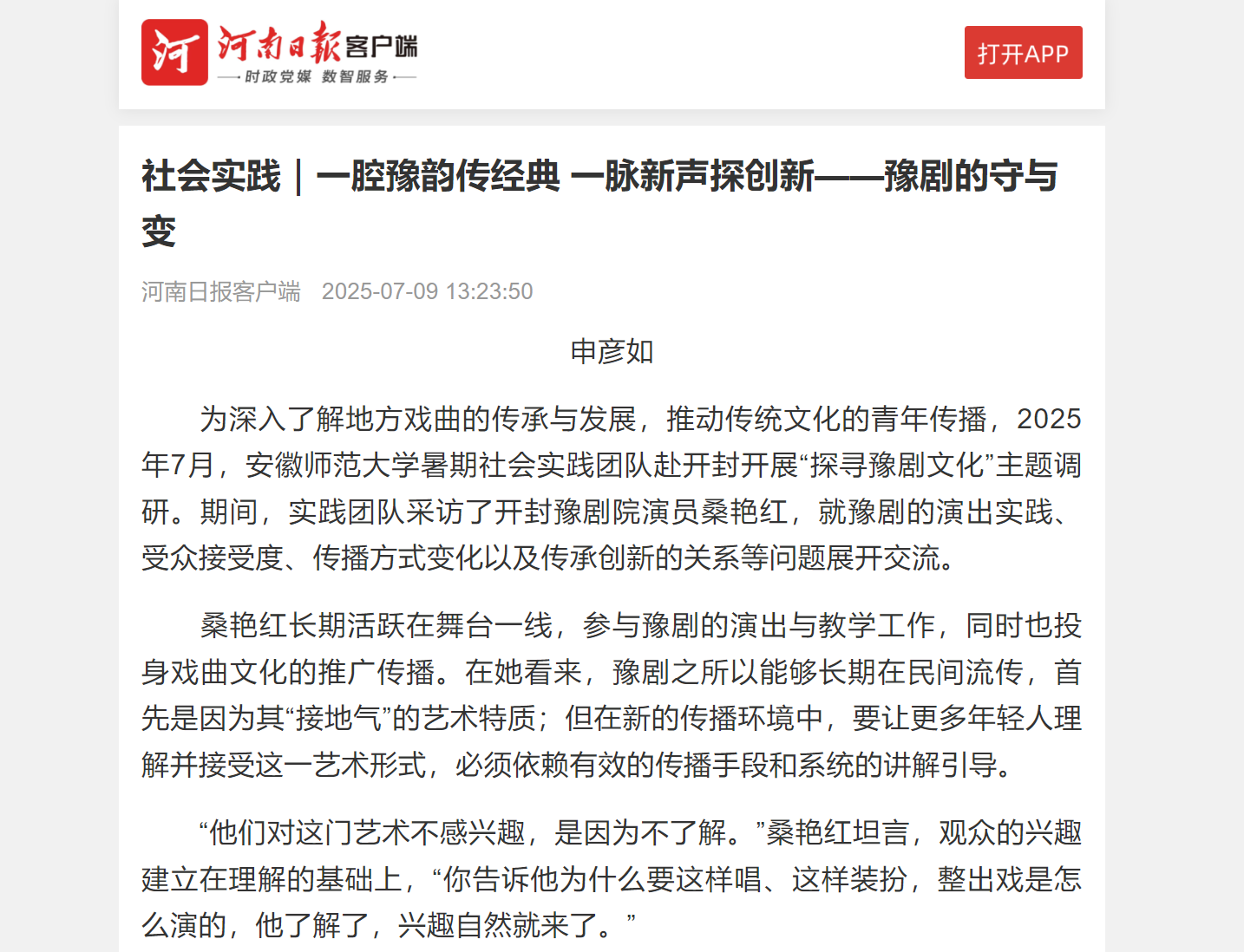 为深入了解地方戏曲的传承与发展,推动传统文化的青年传播,2025年7月,TapTap点点官方网站暑期社会实践团队赴开封开展“探寻豫剧文化”主题调研。期间,实践团队采访了开封豫剧院演员桑艳红,就豫剧的演出实践、受众接受度、传播方式变化以及传承创新的关系等问题展开交流。