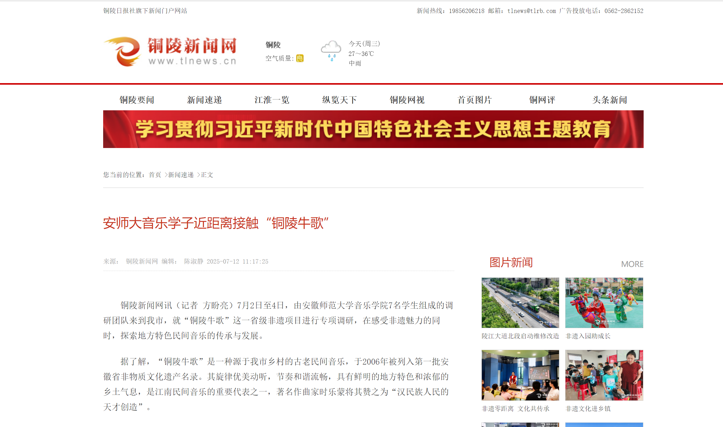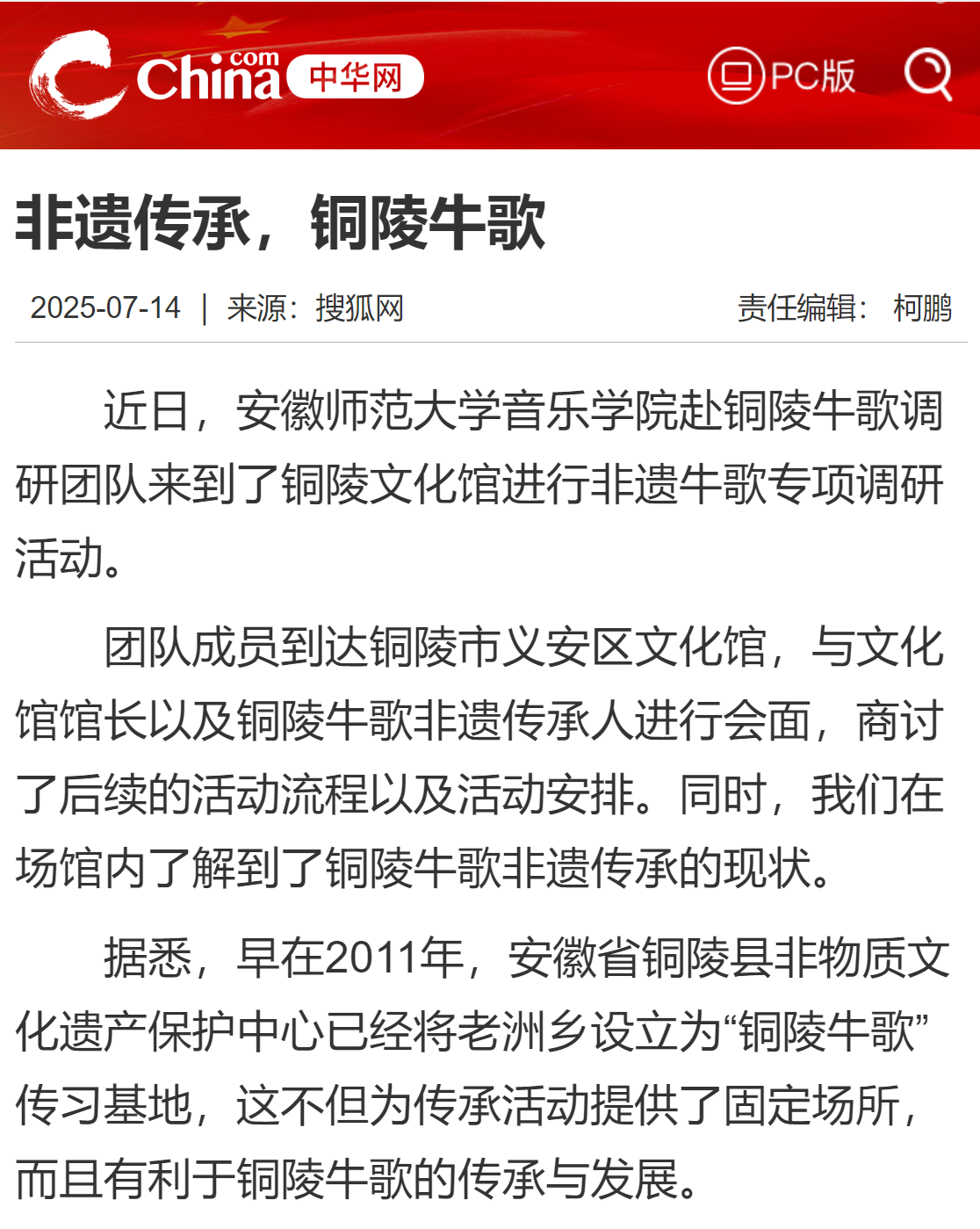 在铜期间,该团队查阅相关文史资料,系统梳理“铜陵牛歌”的历史渊源和发展脉络,并走访“铜陵牛歌”代表性传承人,跟随学习表演牛歌,深入了解“铜陵牛歌”的特色魅力和发展传承等情况。调研团队表示,本次调研旨在深入了解“铜陵牛歌”的艺术特点、传承现状以及面临问题,积极探索创新性传承和推广路径,为“铜陵牛歌”注入新活力的同时,为后续深入研究和传承地方特色民间音乐奠定基础。