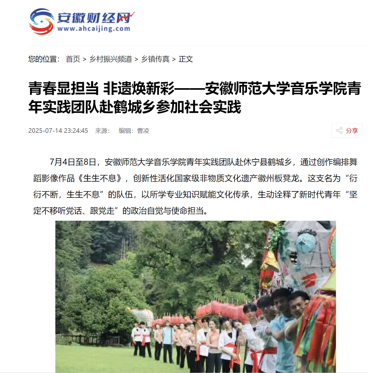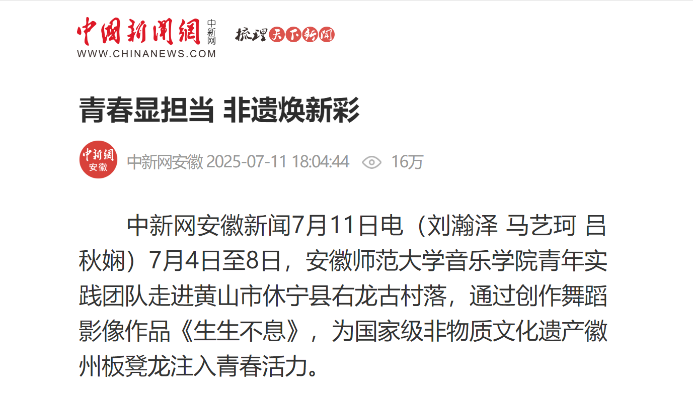 为破解非遗传承的时代难题,团队创作的舞蹈影像《生生不息》进行了传统与现代的融合——既完整保留徽州板凳龙的文化核心与传统阵型,守护文化根脉;又运用现代艺术手法,进行创新表达。同时借助运动相机、无人机航拍等技术实现视角与空间的多元变换,凸显新质生产力在文化传承中的应用。参与创作的青年学子以自信的表现,展现了新时代青年作为“龙的传人”的文化自信与担当。(完)