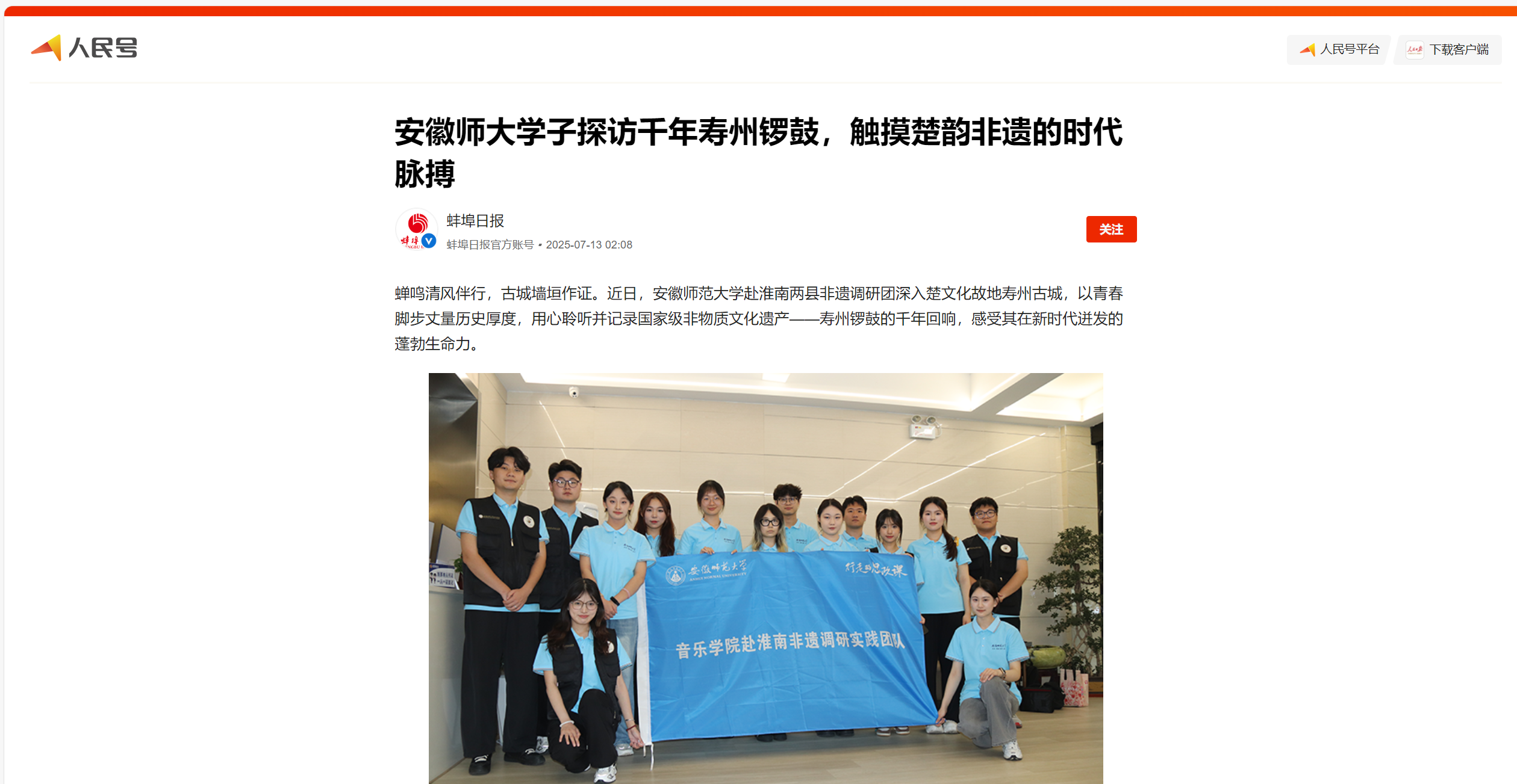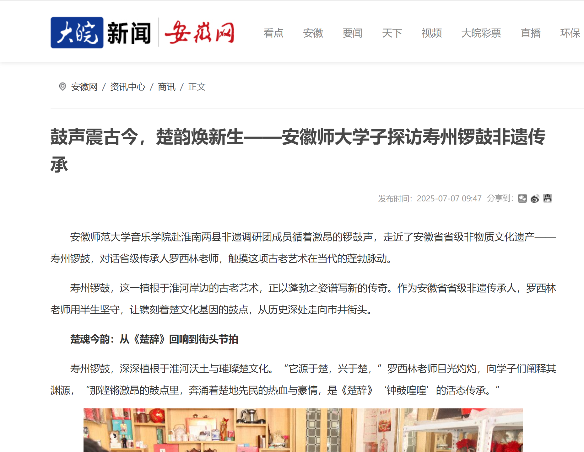 鼓槌起落,是穿越千年的楚风回响;锣钹铿锵,奏响民间艺术的当代强音。寿州锣鼓正以其扎根泥土的质朴与锐意创新的姿态,在非遗传承的道路上踏出坚定而热烈的节拍。(彭涛 摄影 刘锦慧 乐子睿 任梦婷)