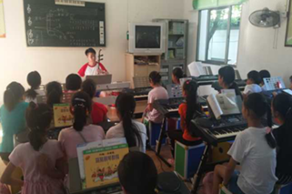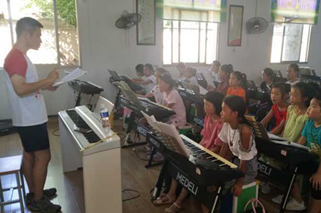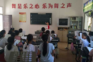 在一周里的支教里团队精心设计的课程有音乐理论、合唱、舞蹈、器乐教授等。合唱课由韦永伦、赖宝林和戴孜曦三位老师授课教唱,孩子们几天内很快就学会了《马兰谣》《小肩膀》《雪绒花》等少儿经典歌曲。音乐理论课由陈柱明老师进行教学,陈柱明老师在授课期间利用独特的教学法,十分受孩子们欢迎。舞蹈课分别由汪旭东、李凌睿、许雅云、周佳、周璇五位老师担任,主要教授了古典舞,傣族舞,藏族舞等舞蹈小组合,让孩子们领略了其他民族舞蹈的特色。器乐课由陈悦、万志翔老师进行教学,陈悦老师在孩子们已有的学习基础上拓展教学,教授了独具特色的钢琴曲《小排钟》,万志翔老师则带孩子们领略了中国民族乐器二胡的风采。在周佳老师上课期间令人意外的出现了突发情况,由于小学条件有限,舞蹈教室没有电扇和空调,有一个孩子在此环境下出现了不适,当时的周佳老师第一时间发现她有些异样便立刻让孩子坐下休息并询问其身体状况,在了解情况后,周佳老师利用其医疗小技巧使孩子的状况得到了明显的好转,之后并通知其家长来接回家休息。周佳老师关心员工的行为得到了当地校领导的认同和员工家长的感谢。