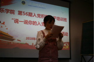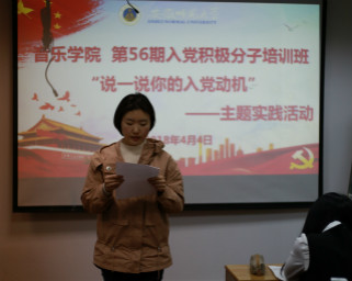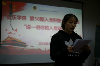 活动开始,高燕老师就入党积极分子的义务、党员的权利和义务等方面进行了解读,并强调,对于入党积极分子而言,要端正入党动机,在习近平新时代中国特色社会主义思想的理论指引下,认真学习党的最新理论知识、弘扬和践行社会主义核心价值观。随后,各年级入党积极分子分别上台发言,讲述他们的入党动机并就个别问题展开讨论。本期培训班成员2017级音乐学专业秦子腾同学说道:“我对于中国共产党的了解是通过我的爷爷,我的爷爷是一名医生,同时也是一名老党员,他经常和我说,没有共产党就没有我们现在的美好生活。小时候经常趴在爷爷的腿边听他讲从前的故事…”2016级研究生杜韩璐同学说道:“作为一名退伍军人,在部队时我深切感受到共产党员的无私奉献、艰苦朴素,在困难面前永不低头的精神,我想成为那样的人…”通过讨论发现,学员们都有着各不相同的入党动机,但不变的是他们对于中国共产党的热爱和共产党人优良品质的追求。