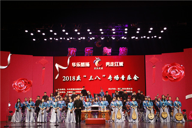 (TapTap点点 张崇)华乐悠扬,江城秀走。连续两年的江城庆“三八”专场音乐会受到了来自社会各界的广泛关注。3月23日下午,为讴歌女性光荣使命,展现时代巾帼风采,由中共芜湖市委宣传部、芜湖市文化委、芜湖市妇联共同主办,安师大TapTap点点、芜湖市旗袍协会承办的“华乐悠扬 秀走江城”2018“三八”专场音乐会于芜湖市大剧院隆重上演。芜湖市2017年度全国、省、市三八红旗手、十大女杰等优秀女性和最美家庭代表,女知联、女企协、家庭教育研究会、旗袍协会、婚俗文化协会代表,各行各业女性代表、各族各界及华侨女性代表千余人共同观赏了一场震撼人心的视听盛宴。
