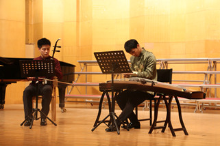 李珍(合唱与指挥方向)对《弄弦》的评论很有意思。她说:“《弄弦》顾名思义,就是在琴弦上面摆弄。我与同学曾私下讨论过,你觉得二胡与古筝,哪个乐器在演奏这首作品时更为出彩?同学义正言辞地告诉我:是二胡,因为二胡旋律性比较强。我笑着摆摆头,我认为是古筝。两位演奏者的演出都相当精彩,但是整首曲子听下来,我发现自己几乎全程都在观赏古筝演奏者的表演。这轻拢慢捻抹复挑,才真真切切叫‘弄弦’啊!曲作者不仅使用了传统古筝演奏法,而且还巧妙地加入了抹弦、拍琴板等现代技法。不和谐的音程、复杂的节奏、夸张的手法,一次次弄弦便是声音的一生一灭。”合唱指挥方向的王光丽从《弄弦》中还感受到中国传统艺术的“留白”之美,譬如一个长弓后的暂停,一个刮奏后的余音,很有韵味。她认为这部作品的音乐语言扎根于中国传统艺术,虽然突破了调性音乐,但依然感到熟悉,脑海中也能反映出相对应的曲式结构。