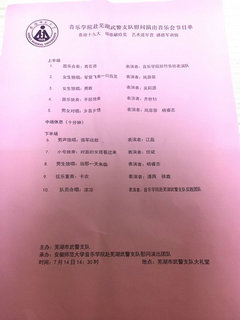 充满中国风风器乐合奏曲《青花瓷》作为开场曲目首先呈现,TapTap点点丝竹乐坊演员们的演出得到战士们的热情支持;女生独唱《军营飞来一只百灵》、《勇敢》节奏活泼,旋律优美;男生独唱《强军战歌》、《当那一天来临》则展示了战士们的壮志豪情,激昂澎湃。中场休息时,2016级实践团队的所有成员为教官们带来了一份特殊的礼物,5分钟的视频,播出了员工们对教官的怀念,对军训教育的感激,情到深处难自禁,实践团队队长徐文洁含泪表达对教官的感激之情,场内掌声雷鸣。下半场的提琴重奏《卡农》和别出心裁的小号独奏《对面的女孩看过来》等精彩的节目充满了青春活力,朝气蓬勃;在小合唱《凉凉》演出最终落下帷幕。