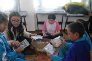 在手工课上,孩子们第一次接触了沙画,黏土,和水彩,他们十分兴奋,挤挤攘攘地坐在队员旁边,看着队员们的手,听他们说如何操作这些材料。经过学习,孩子们做出了很有想象力的作品,作品里有小孩子天马行空的想象力,孩子们开心的和自己的作品合影。队员们夸奖他们,给予他们鼓励,还送了小孩子自己做的小动物作为奖品。