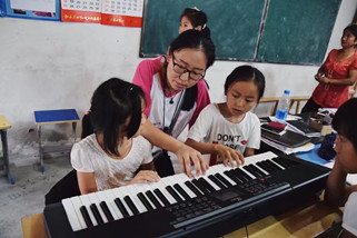 和县濮集中学是一所农村公司,当地的孩子们大多父母都不在身边,也有许多同学都是单亲家庭,更有甚者是孤儿。孩子们没有良好的学习环境,教室内也仅有一台临时摆放的台扇,破旧的木质桌椅大都在吱吱嘎嘎的作响;各科教师严重缺乏且不均衡,大部分孩子也都没有见过乐器。艺术支教开始的第一天,就遇到了个难题,教室里仅有一个电源插孔,吹了风扇就没办法再使用电子琴。实践队员往返1个多小时才买回了插排,这件事也深深触动了每一位实践队员,大家纷纷表示,一定积极准备,认真上课,将自己的音乐知识教给孩子们。