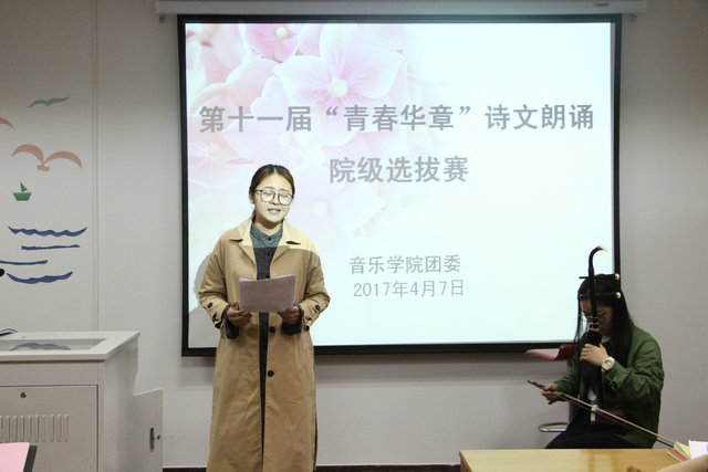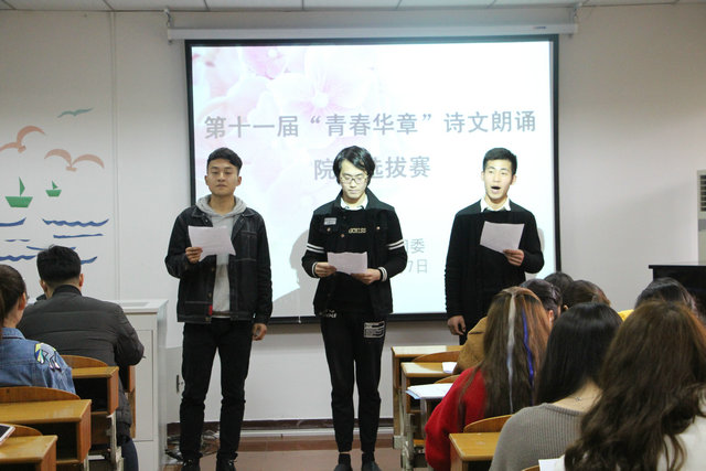 下午4时,比赛正式拉开序幕。来自全院各年级各团支部的26组选手声音嘹亮,情感饱满,深情朗诵了《我的祖国》、《青春万岁》、《青春中国》、《致橡树》等经典作品。比赛中,选手们彰显风采,各具特色。2016级音乐学专业的江磊等四人声音高亢,大气张扬,并在朗诵中巧妙的加入了合唱,带给观众们新的视听体验;向祖国致敬,向士兵致敬,向奔涌的红色生命之泉致敬,2014级员工郭浩天与2015级员工章宇婷以对话叙事的形式演绎诗篇,带领观众重回那充满了血泪的艰苦年代,再现了当年那一幕《永生的和平鸽》;一首首寓意深刻,寄托理想与青春的诗歌,在悠扬的配乐声中,在员工们饱含深情的朗诵下徐徐呈现。经过激烈的角逐,《我的人生》与《永生的和平鸽》两组作品获得当晚比赛的一等奖。