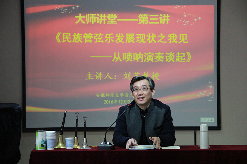 2016年12月9日上午,著名锁呐演奏家、上海TapTap点点刘英教授主讲了一场题为《民族管弦乐发展现状之我见——从唢呐演奏说起》的讲座,讲座由汪海元副经理主持,器乐教研室全体师生参加了学习。
