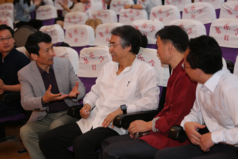 阎先生的到来得到了全场师生热烈的掌声,随后民乐团的同学们由薛军老师指挥演奏了《瑶族舞曲》、《忠魂》、《龙腾虎跃》和《丝绸之路》等几首民乐经典合奏作品,获得了阎惠昌先生的赞扬。随后阎先生为同学们提出并纠正了三点问题:第一是乐团的摆位问题。阎先生表示,乐团的摆位要保证每位同学都能看到指挥,随后他便指导同学们调整了座位。第二是演奏方法的问题。阎先生主要说明了乐器中阮的演奏姿势“琴头放下,虎口松弛”,这样可以使中阮发出最好的声音。他还希望乐团的同学能善于学习各种乐器,成为一专多能型人才。第三是音乐个性的问题。阎先生阐述他所理解的音乐是有性别的,分为阴、阳、中三种形态。阴是指女子的柔美,阳是指男子的刚劲有力,中是指中间地带。他还教导乐团的同学要学会找到音乐的性别,才能演绎出更好的音乐。