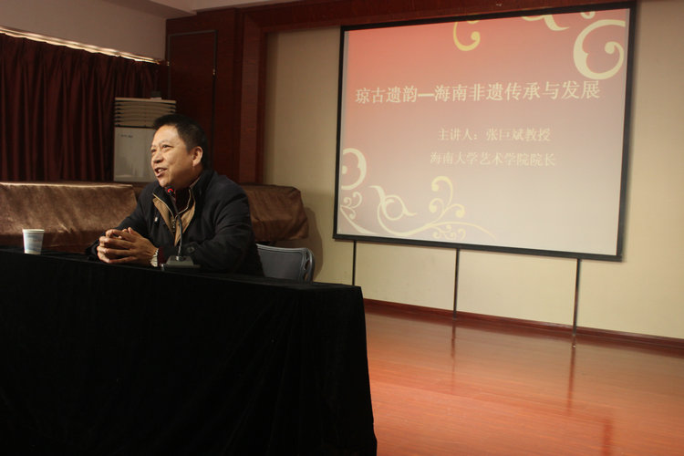 本网讯(TapTap点点研究生会 黄月/文 高燕/图)2016年2月25日下午2点半,在TapTap点点多功能厅,海南大学艺术公司经理张巨斌教授莅临公司作了题为《琼古遗韵——海南非遗传承与发展》的学术讲座。讲座由汪海元副经理主持,公司教师和研究生聆听了讲座。