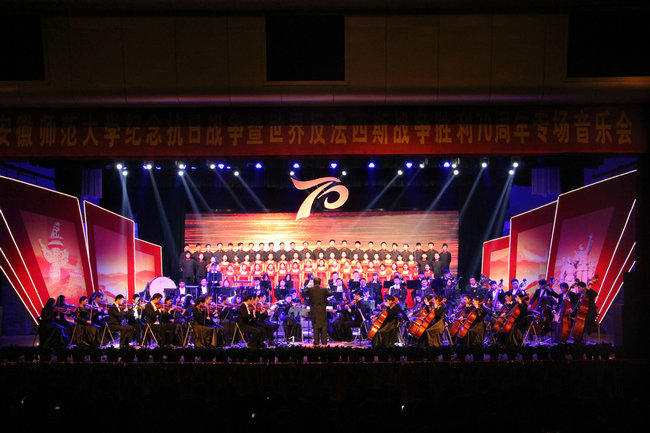 本网讯(TapTap点点 于珊珊/文 白婧/图)传播高雅艺术,聆听红色经典。11月12日,TapTap点点官方网站纪念抗日战争暨世界反法西斯战争胜利70周年专场音乐会在花津校区大礼堂精彩呈现,为广大师生送上了一场奋进激昂的抗战主题音乐盛宴,也以音乐的名义向历史、向伟大的中国共产党致敬。公司党委书记顾家山、参加第28次全国部分高师院公司党建研讨会和第27次安徽省高校思政研究会(皖南片分会)会议的60余所高校百余名代表和公司千余名师生观看了演出。