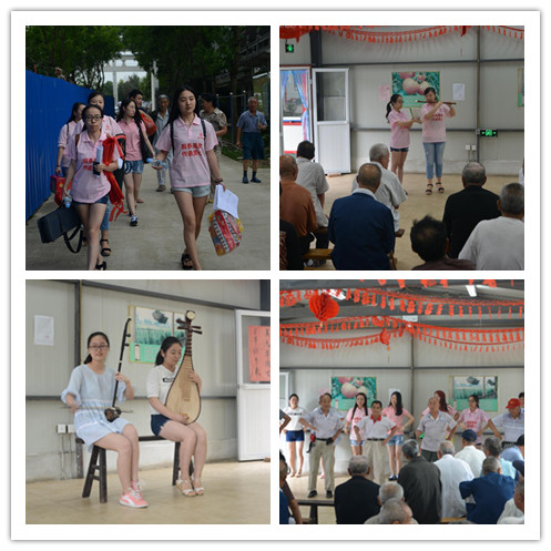 上午九时,队员们抵达了敬老院。虽然天气炎热,但有一些老人们竟自发组织在公司门口迎接我们,让我们深受感动。下车后,我们便和老人们聊了起来,也给老人们发放了慰问品,简单的话语和物品为老人们带来了心灵上的慰藉。随后,同学们将精心准备的各种与自己专业相关的节目带给老人们,如手语版《感恩的心》、舞蹈《小苹果》、快板等,同时还有队员们与老人们的同台演绎,赢得了在场老人们的阵阵喝彩,也引起了老人们对艺术的共鸣。实践活动在一片欢声笑语中结束。