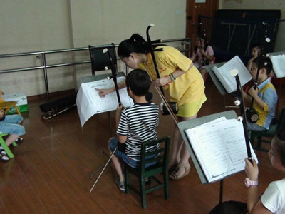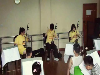 7月11日,队员们来到马鞍山市钟山培训公司和育才小学。在宽敞明亮的音乐教室里,同学们看到的是孩子们一张张纯真可爱的笑脸。曹源、杨慧珏、许晴等同学手把手的教授二胡的演奏方法,并亲自示范了《凤阳花鼓》《炫动》等曲目。教学结束后,二胡专业的队员们还表演了《赛马》《青花瓷》等经典曲目。丰富的内容、高超的演奏技巧,深深地吸引着小朋友们,让他们在音乐的海洋里畅游,让大家感受到音乐无与伦比的魅力,孩子们学习的不仅是演奏二胡,更重要的是了解各类乐器所包含的丰富文化。精彩的二胡教学和互动,得到了当地公司老师的肯定和孩子们的喜爱。