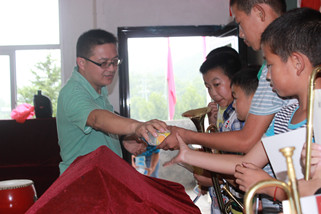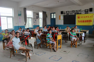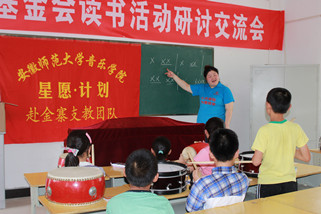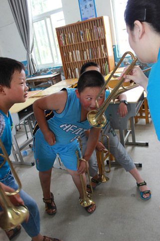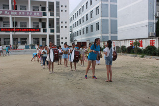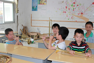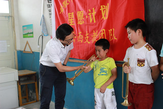 山间小路蜿蜒曲折、颠簸难行,几经周折队员们终于达到目的地,孩子们早已有秩序的坐在教室里等着我们的到来。老师和员工们给以我们实践队员最大的欢迎和热情,队员们忘记暑热疲惫,给孩子们带去轻松欢快的音乐课程。带队老师和队员教他们吹号、打鼓、基本乐理知识,一起唱歌、跳舞、做游戏,每个人都是满头大汗却笑的无比灿烂和开心。一天的教学编排,孩子们的鼓号队逐渐成形,伴随着还不太整齐的乐曲声,烈日下一张张快乐、幸福、认真的小脸,让我们深深体会到充实和骄傲。音乐有着神奇的力量,拉近人与人间的距离,使你我不再陌生。